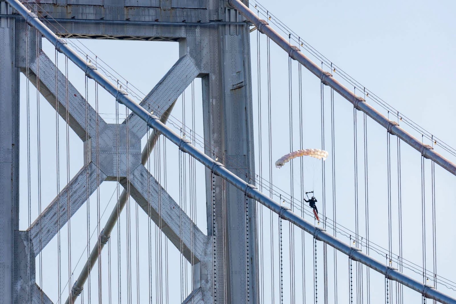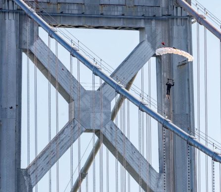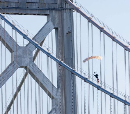After circling above the bay, MacCormac swooped down, deployed his parachute, and aligned for the grind. At 9:36 am, the board kissed the cables and he slid along them for a few glorious seconds before spiralling right and landing on a floating platform below amid cheers from a crowd along the Embarcadero.