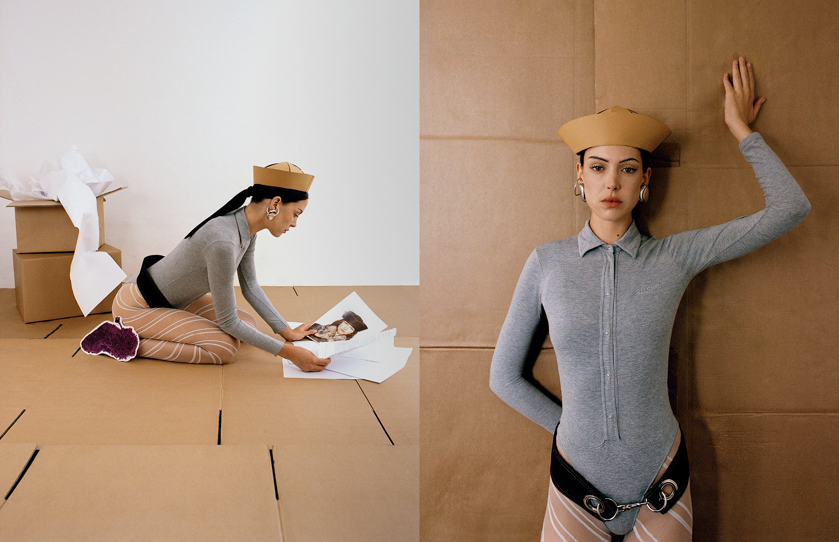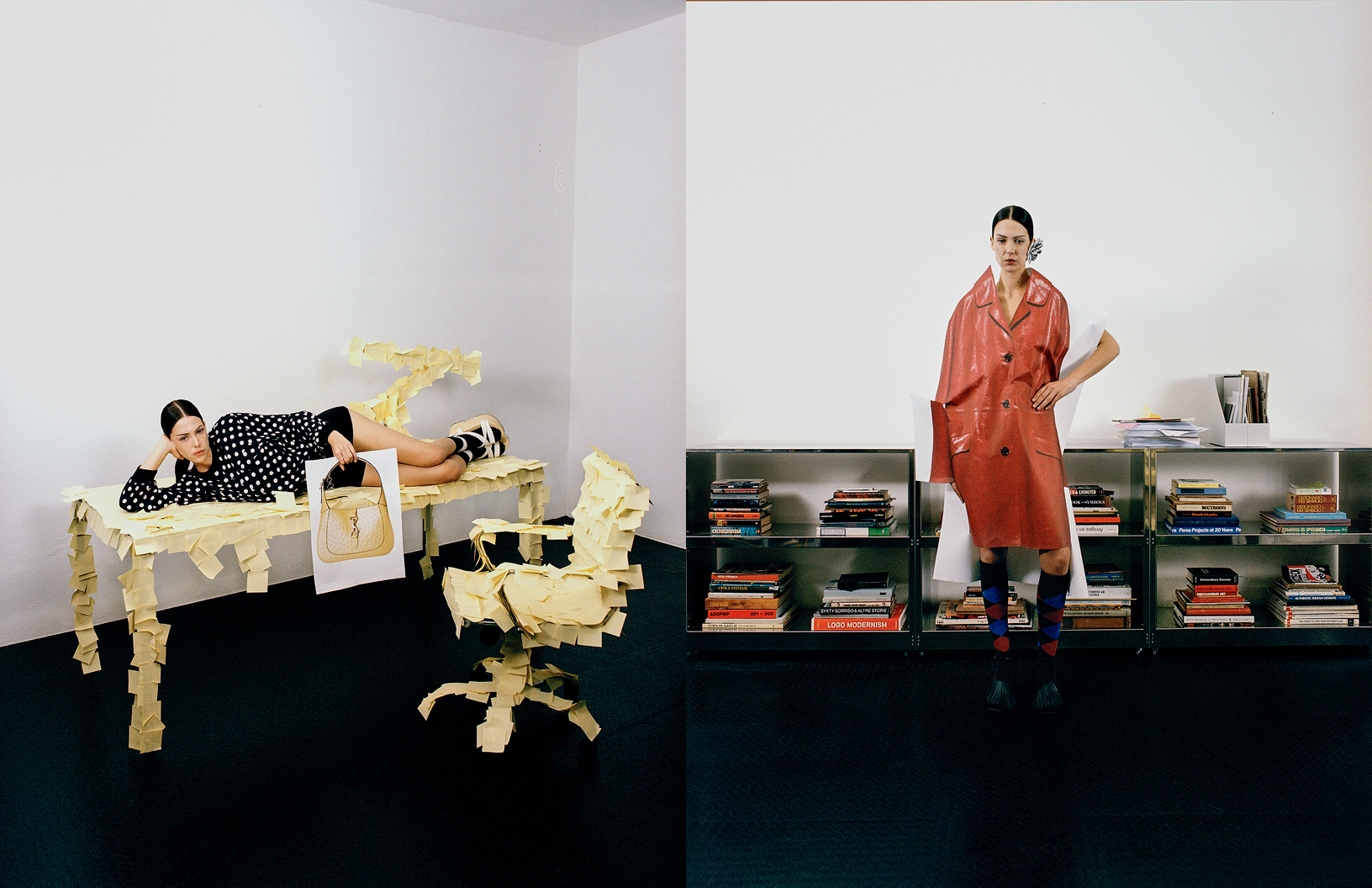 Freed from the constraints of availability and brand permissions, this visionary approach opens the door to limitless creativity, where style exists untethered from logistics. Each meticulously crafted print is seamlessly woven into styled scenes, playing with perception and elevating fashion to the realm of the surreal. Against a backdrop of towering boxes, scattered paperwork, and the quiet chaos of a stylist’s world, the editorial captures the unseen labor behind fashion’s polished façade.