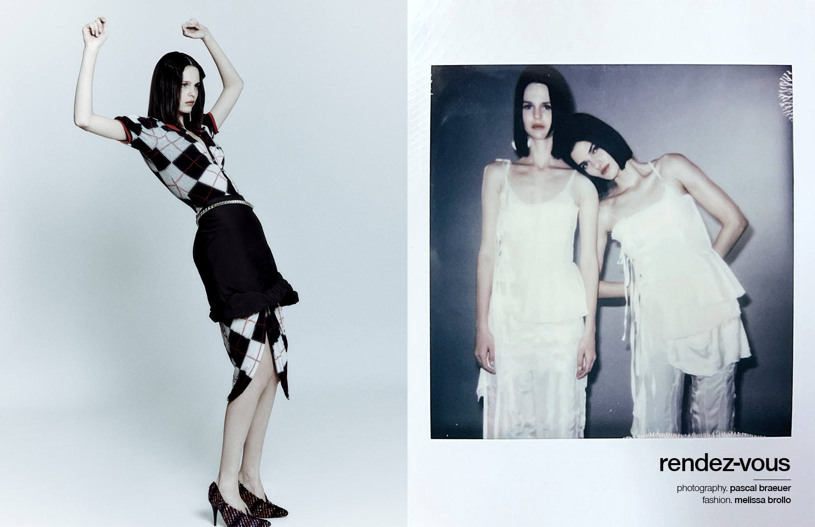 Have a little rendez-vous with models Valeria Fedorino and Valeria Neshko in this Schön! editorial photographed by Pascal Braeuer with fashion by Melissa Brollo who styles the pair in looks by Vivienne Westwood, Marni, Miu Miu and others. Hair is by stylist Dominique Ascione with make up by artist Edoardo Bacigalupi.