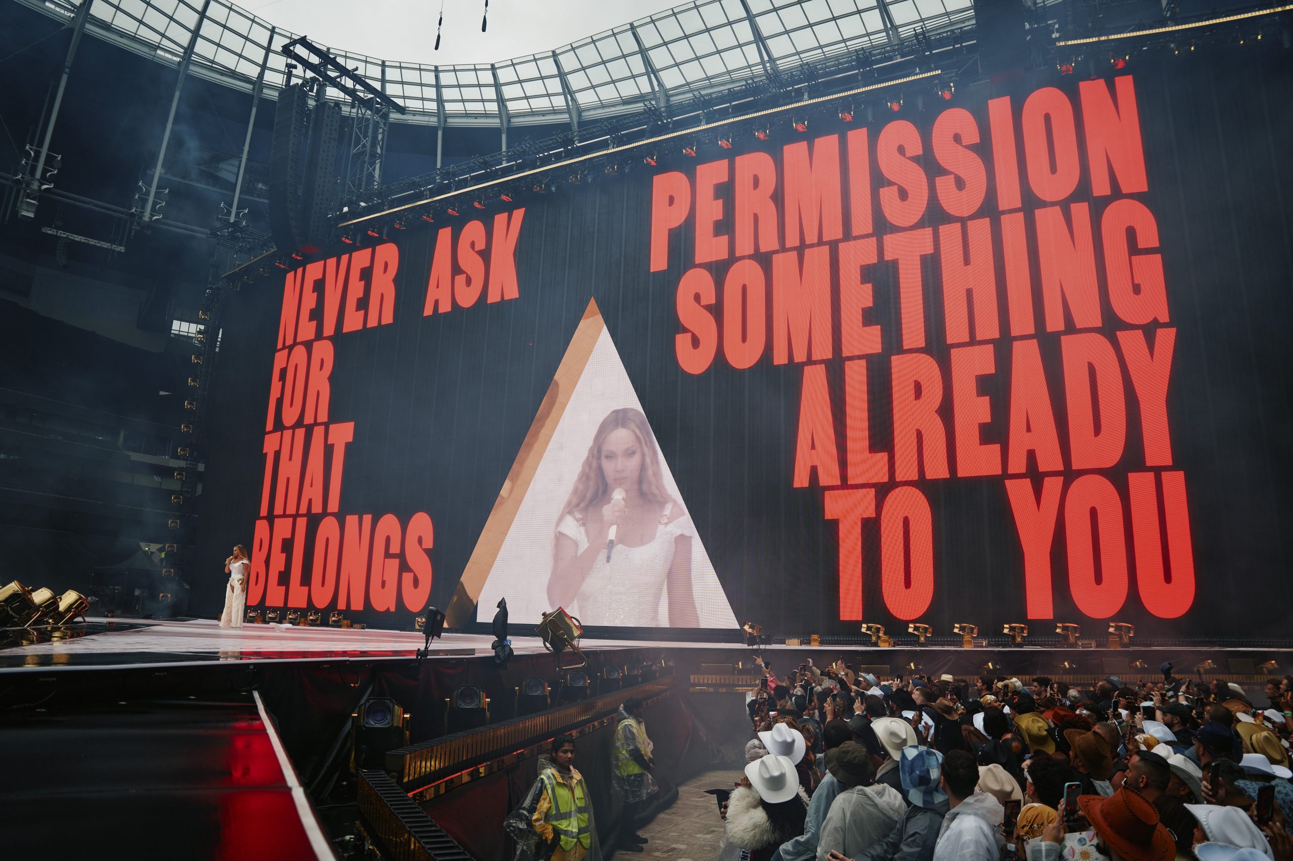 Beyoncé is the master of creating cult-like universes with her albums. Much like her popular 2023 ‘Renaissance’ tour, the Beyhive arrived dressed on theme, making the stadium a sea of leather boots and cowboy hats. ‘Cowboy Carter’ is deeply rooted in the genre’s Black Southern origins. The genre may not have as much cultural footprint outside of the US, but Beyoncé’s deep passion for her heritage radiated throughout the stadium as she proudly waved the red, white and blue flag. Admittedly, certain moments, like her flawless rendition of America’s national anthem, did create a brief disconnect for the majority European audience. But in the wider context of ‘Cowboy Carter’ themes like ownership and identity, Beyoncé’s odes to the US were a powerful symbol of reclamation.