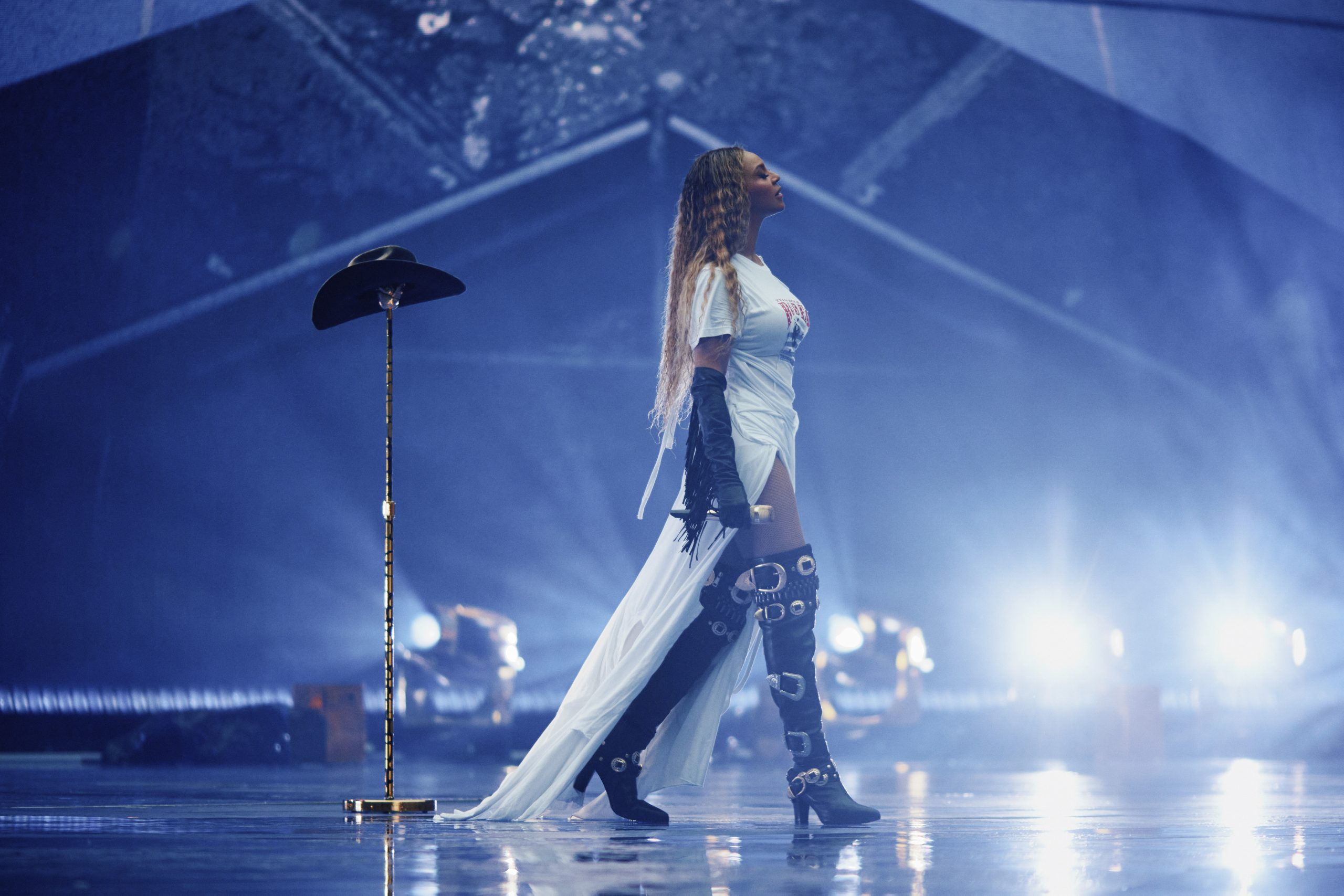 “THIS IS THEATRE” boldly displayed on the screens of the Tottenham Hotspur stadium on 7 June. The statement perfectly captured what to expect when seeing a seasoned superstar like Beyoncé live: performance and production is everything. On the second night of the ‘Cowboy Carter’ tour’s six-night run in London (Paris is next!,) the Grammy-winner’s vocals were an impressive tour de force throughout. Her range was remarkable, transitioning from infectious rap to faultless opera. Even under foggy rainfall, Beyoncé took it all in her stride, laying down on the middle of stage unphased and pitch perfect.