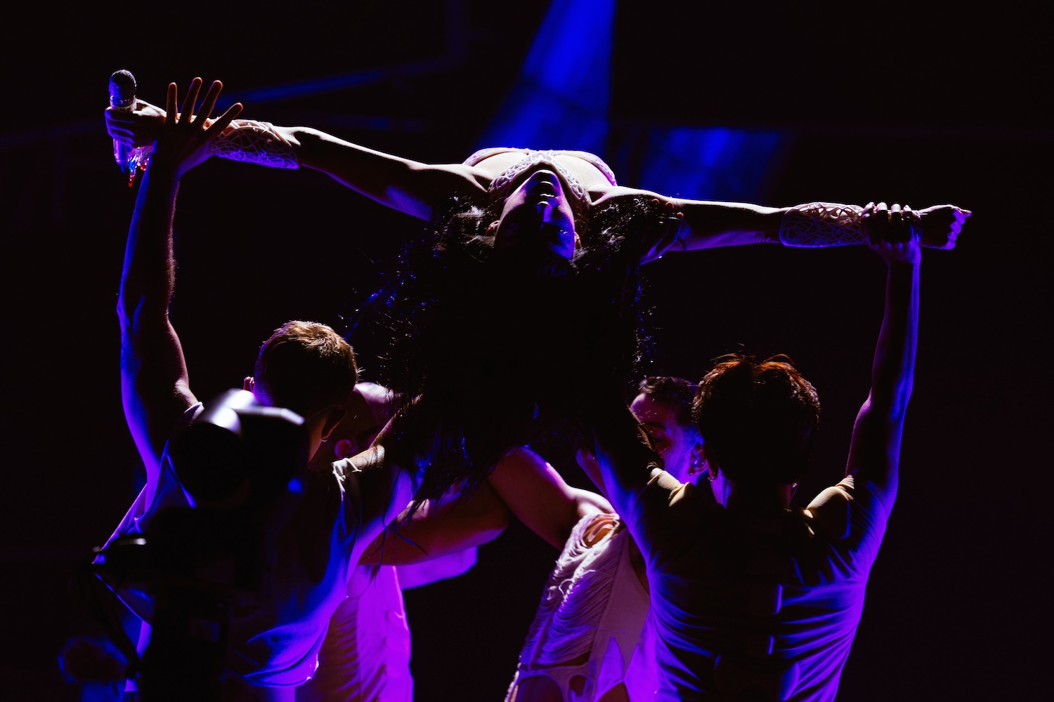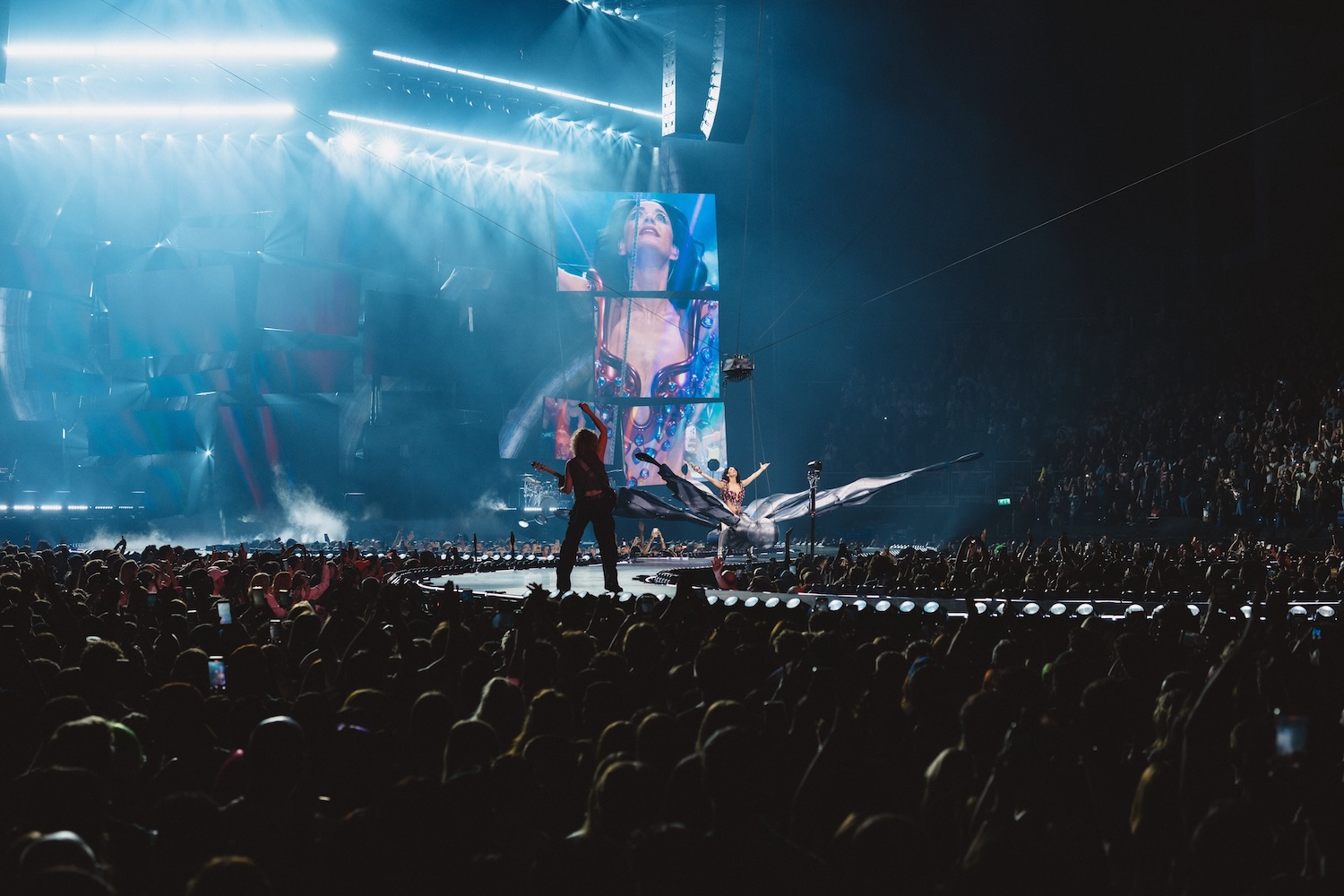 The second act delivered a pure shot of nostalgia with an abridged medley of classics like ‘California Gurls,’ ‘Teenage Dream’ and ‘Last Friday Night (T.G.I.F.),’ along with the more controversial ‘143’ lead-single ‘Woman’s World,’ sending the arena into a synchronised, high-energy dance party. Meanwhile, a special moment for ‘I Kissed a Girl’ saw her spinning mid-air in a glittering cage, cementing the track’s status as a foundational pop moment. But she never seemed to enjoy being on the ground for long, as she was soon flying and spinning across the arena while singing ‘Nirvana.’