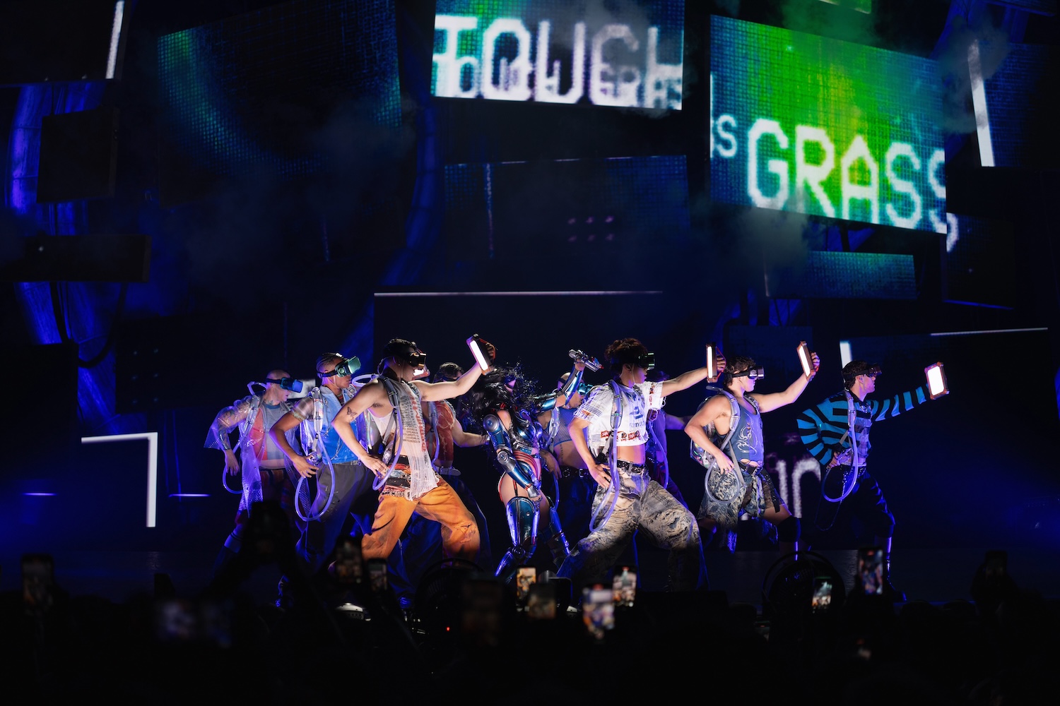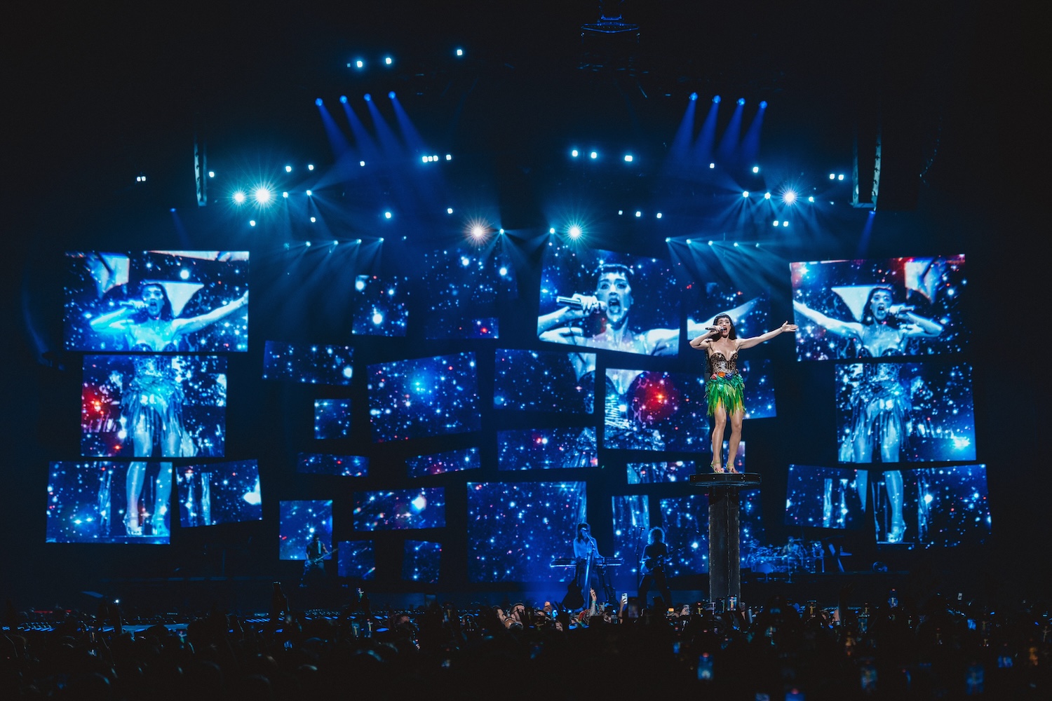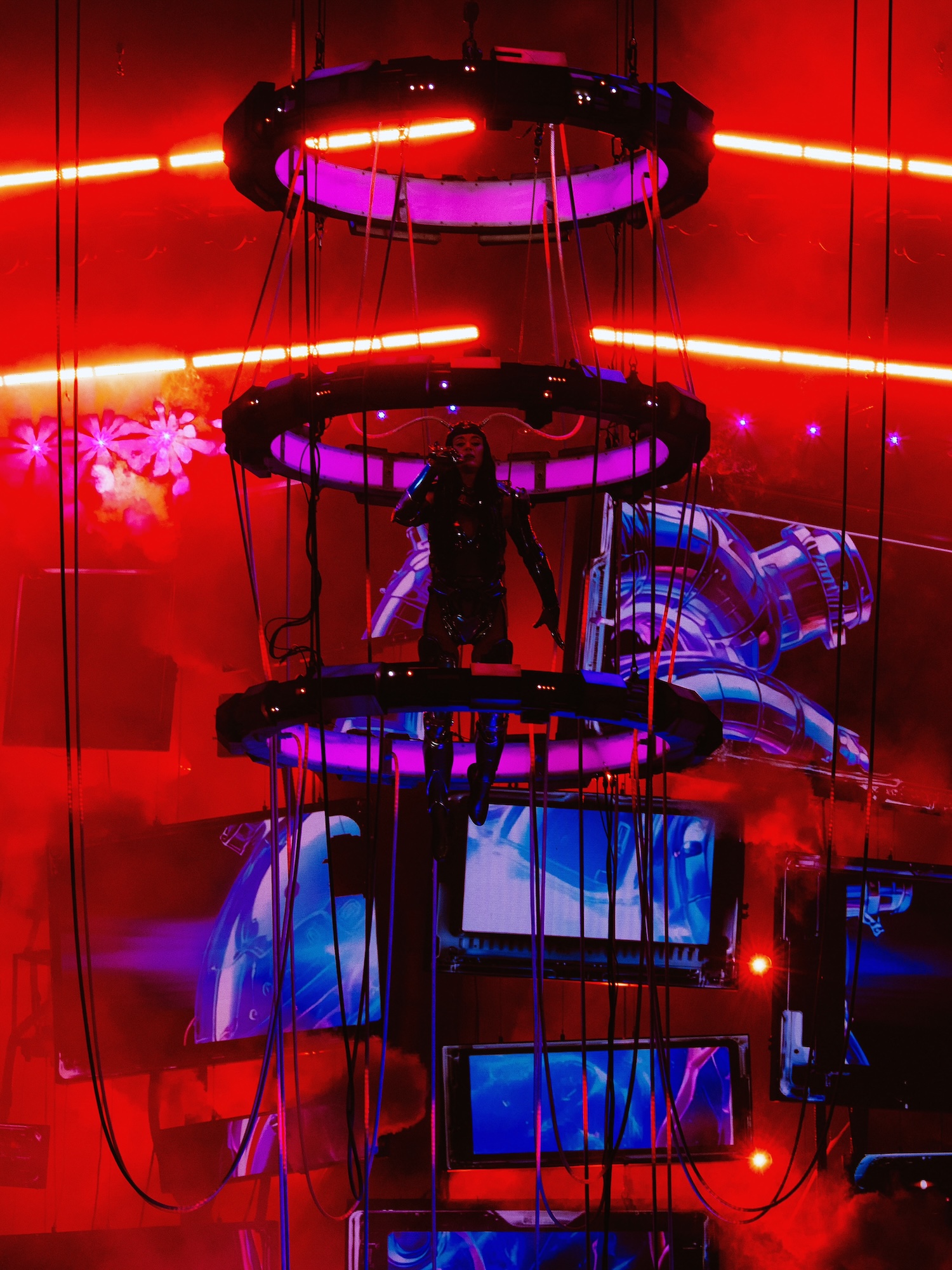 The concert opened strong: Perry emerged from the middle of the stage, floating mid-air, engulfed in a cylindrical portal while encased in a futuristic, campy cyber costume attached to glowing cables. ‘Artificial,’ the opener and theme of the first act, was a showstopper. Following this, the star treatment was reserved for the songs that define her era: ‘Dark Horse’ exploded with a high-drama setup, followed by more subtle message-led ones like ‘Chained to the Rhythm’ and ‘Teary Eyes.’