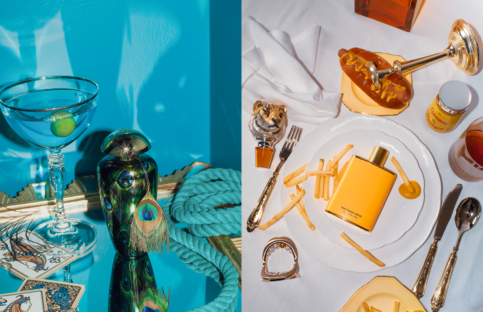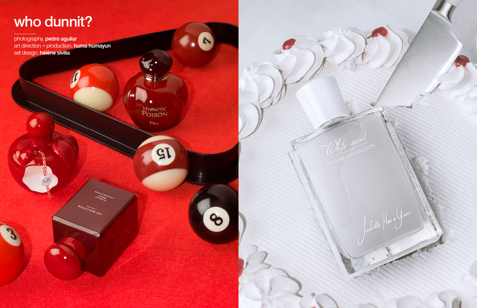 In this playful fragrance editorial, desire and deception are intertwined, inspired by the “who-dunnit” stories. From Dior’s Hypnotic Poison poised among billiard balls like a femme fatale in red to Juliette Has a Gun slicing through the sweetness of whipped cream dreams, each scent a clue. Joining the mystery are scents by INITIO Parfums Privés, Parfums de Marly and others.