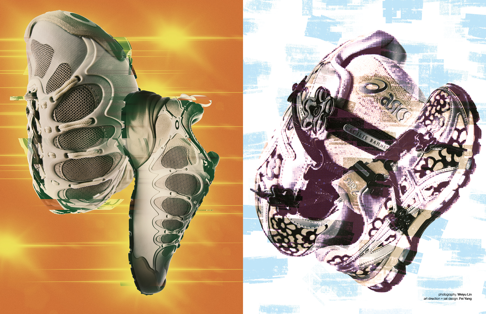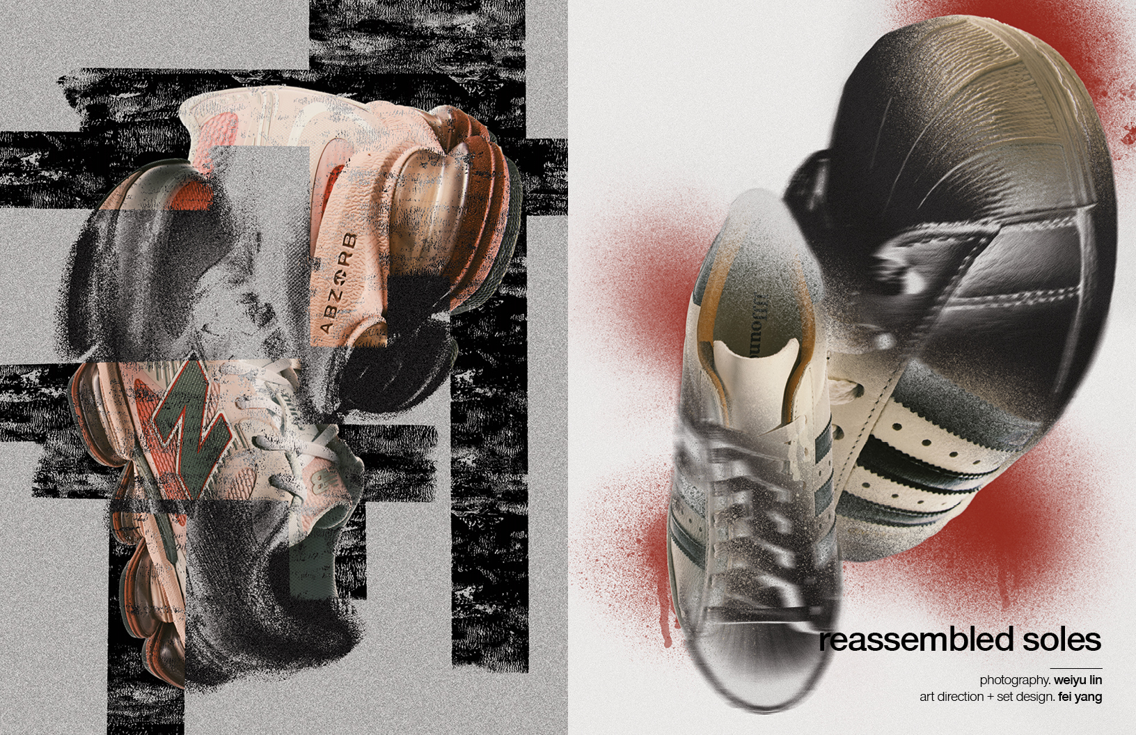 Fragments. Layers. New stories beneath every step. In this Schön! 49 editorial, each shoe transcends its functional purpose, reinterpreted through layers of fragmentation and collision. Through cutting, overlapping, and reassembling, these collages construct new narratives of identity and motion. The familiar becomes disrupted and transformed — every sole bearing not just the imprint of its history, but the potential for continual reinvention. Photographed by Weiyu Lin with art direction and set design by Fei Yang.