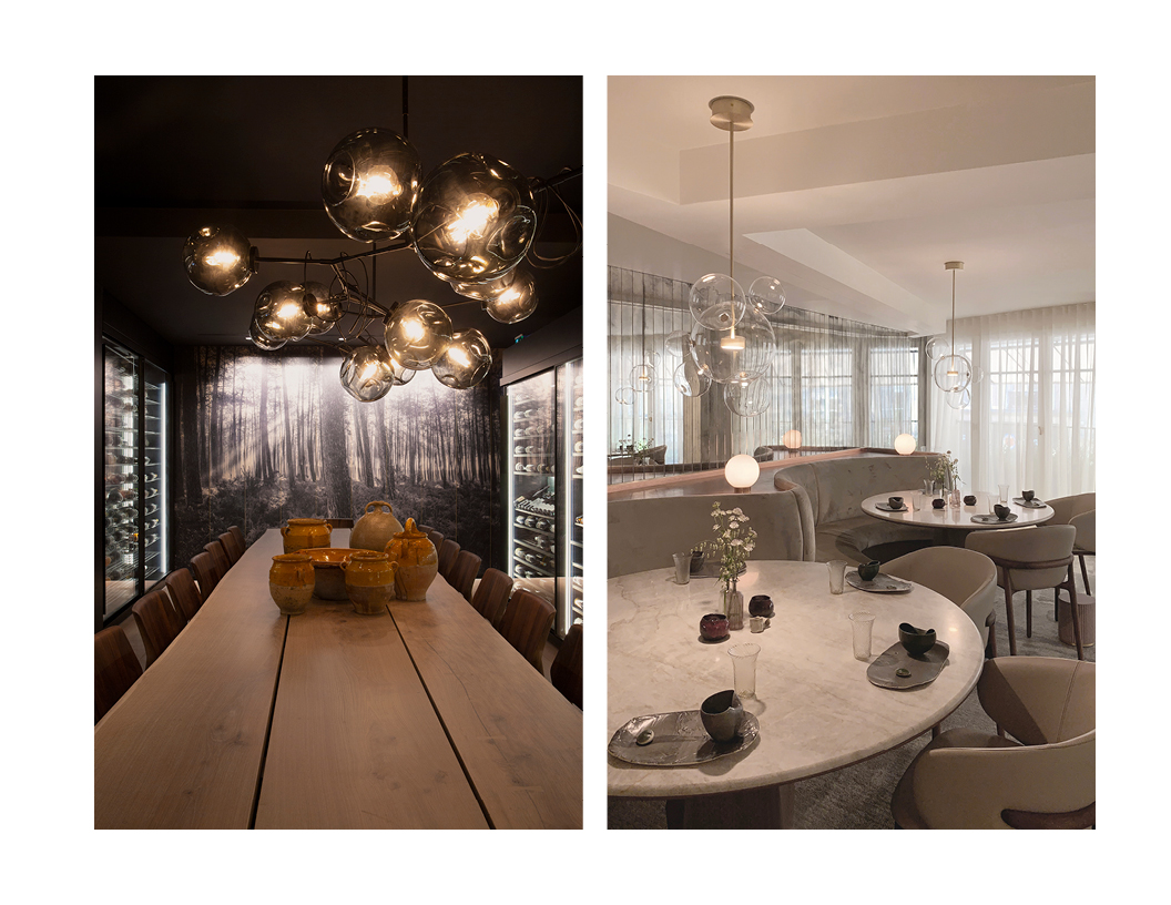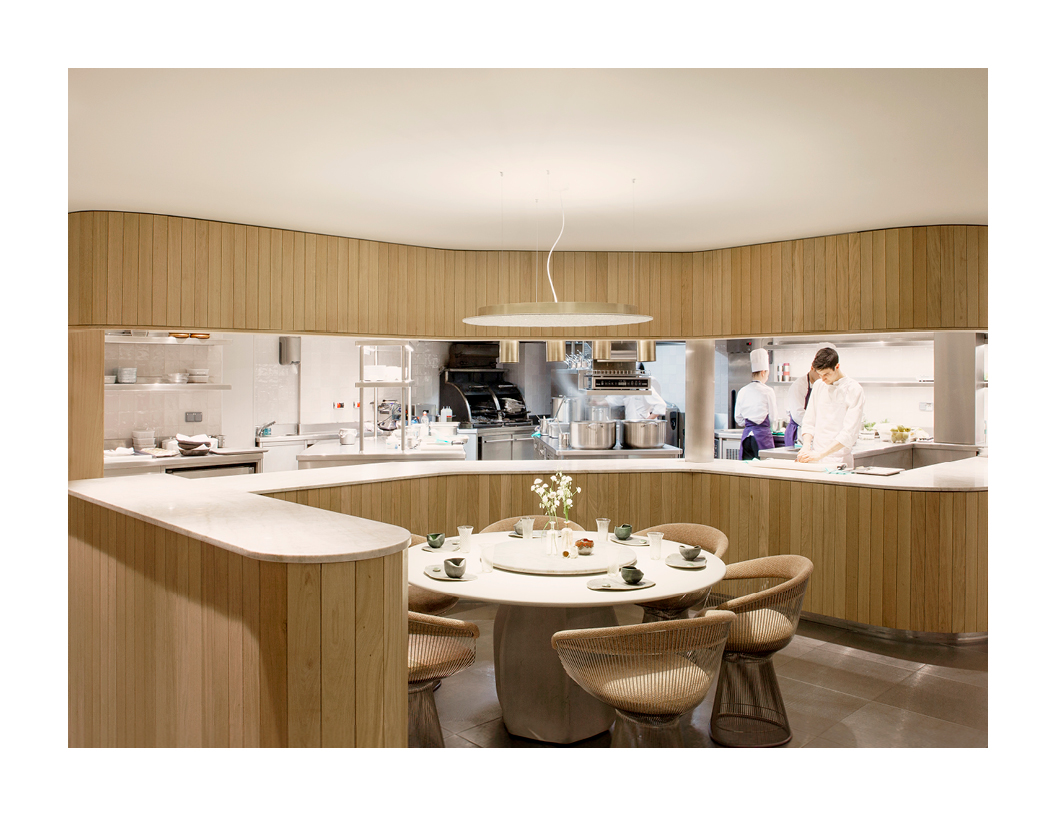 Sharing is an essential part of her vision, and while food is inevitably key in that respect, the notion of sharing extends into other dimensions. On the ground floor of Marsan, for example, a long communal table invites strangers to experience a meal together. Moving upstairs into the main dining room, guests are welcomed by a wall lined with items from Darroze’s family home in the southwest, along with family photos and items from Darroze’s home in the southwest, and, from the open kitchen, the brigade greets each guest personally.