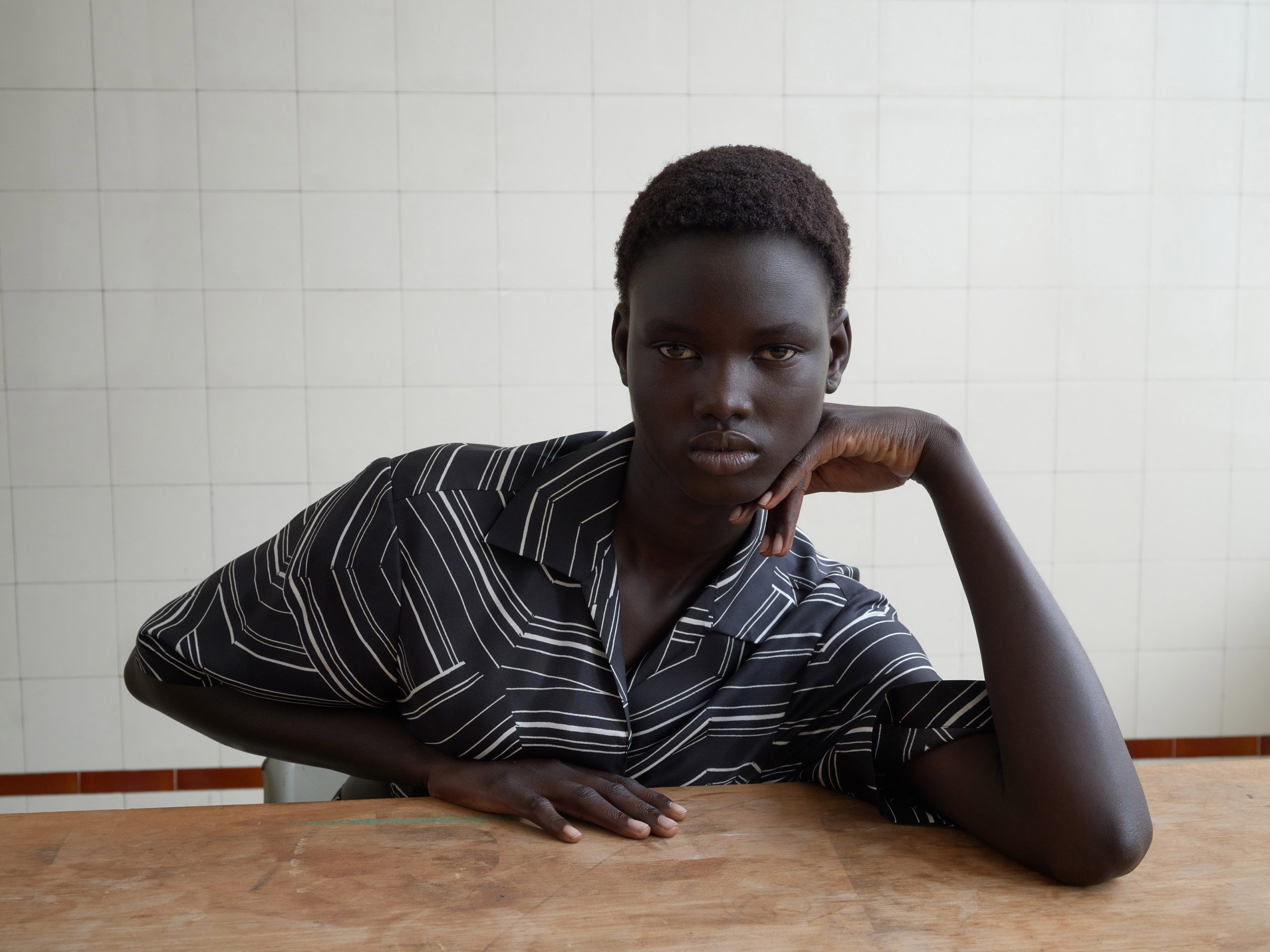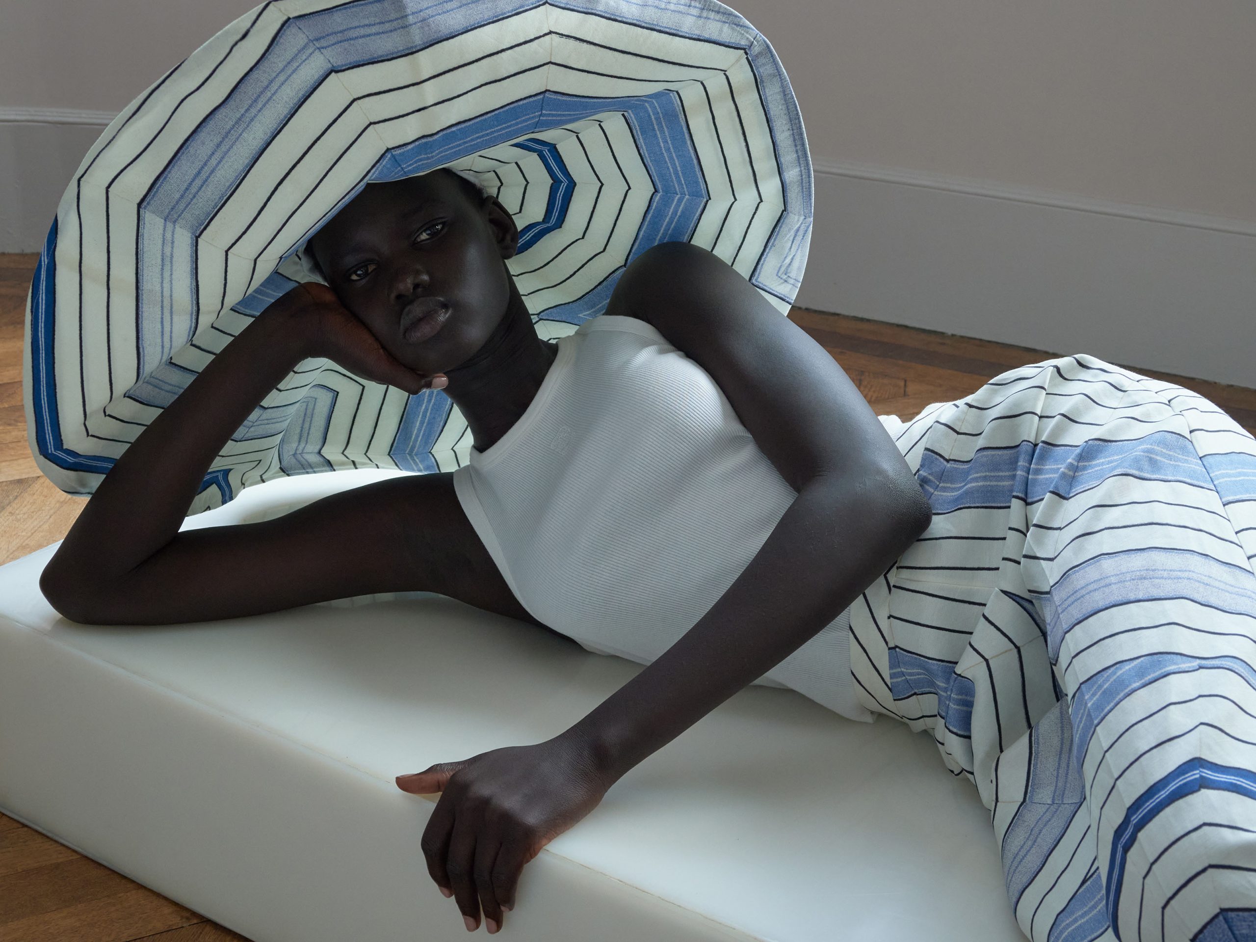 The collection features over fifteen summer pieces: fluid shirts and trousers, light dresses, a parasol skirt in patchwork stripes, shorts, scrunchies, and a wide-brimmed hat — as if Louise Bourgeois herself had crafted them. Natural materials take center stage: silk twill, linen blended with viscose for added sheen, and cotton gabardine for denim trousers. The color palette revolves around shades of blue, reminiscent of the Mediterranean — a region close to my heart, as I was born and raised in Rabat, Morocco.