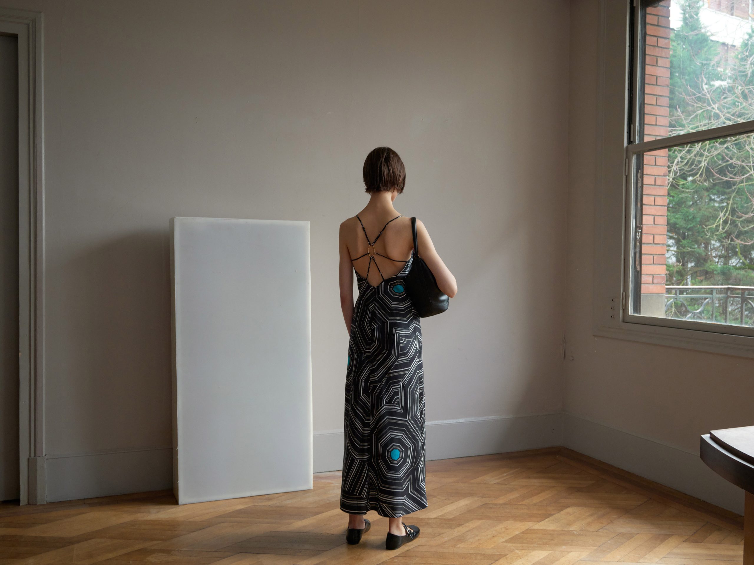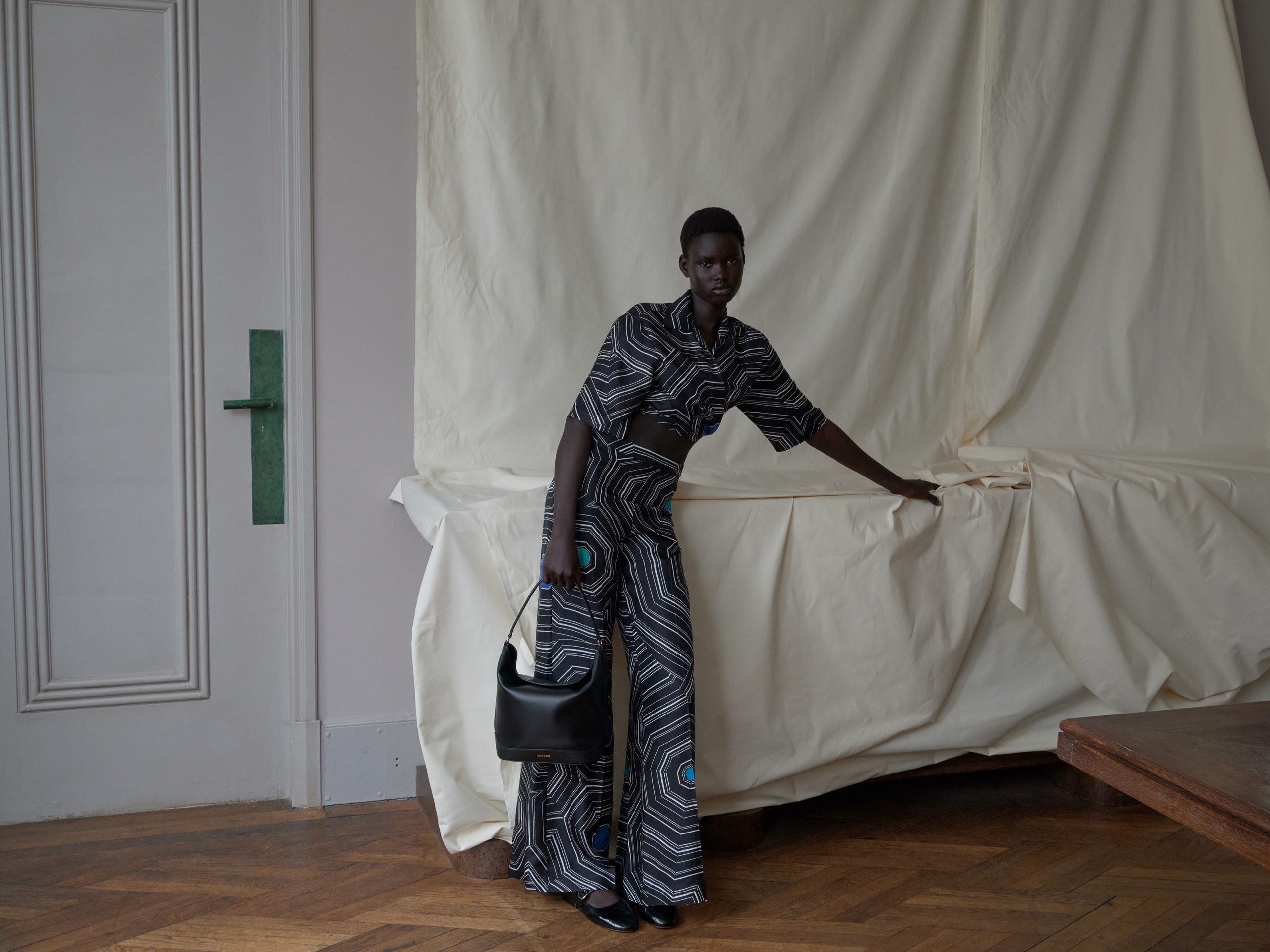 We didn’t take it literally. First, through material choices — Louise Bourgeois’ work is expressed on feminine fabrics, with 70% of the collection made from silk, which immediately brings softness. Then, through the season itself — summer. At times, Bourgeois’ motifs evoked parasols more than spiderwebs to us. This capsule is bright and summery. These elements balanced with the strength of Louise Bourgeois’ work, creating contrast — and at Sandro, we love playing with contrasts.