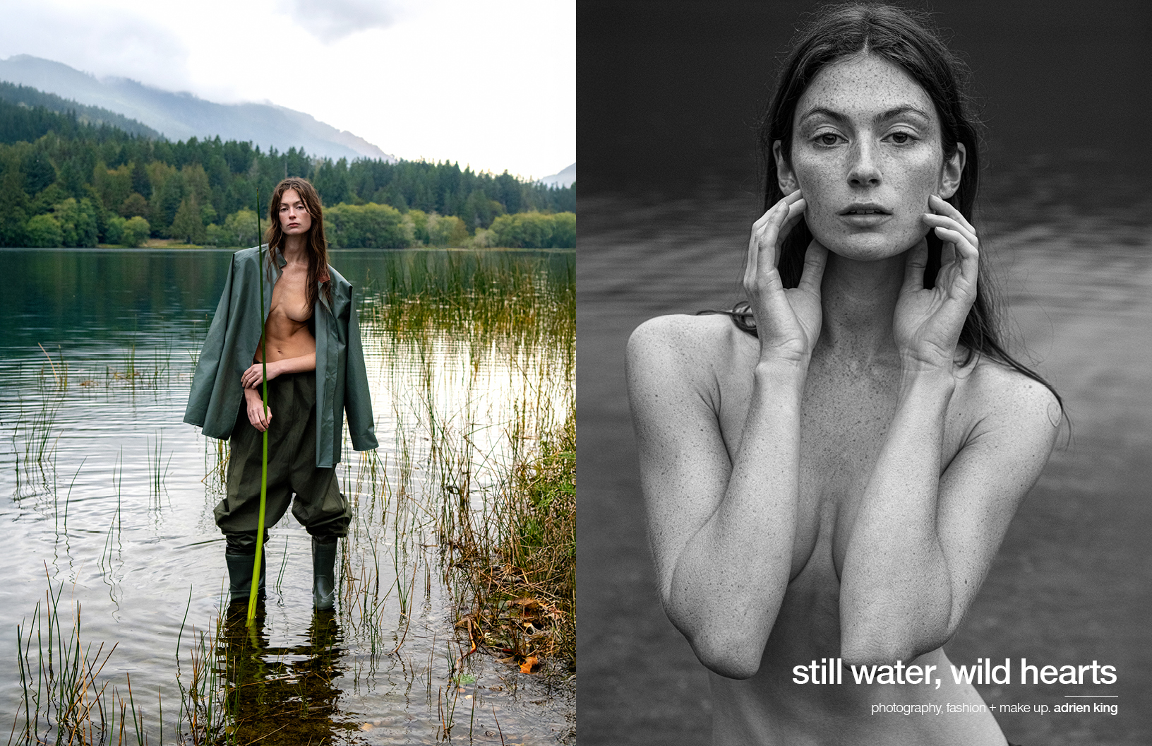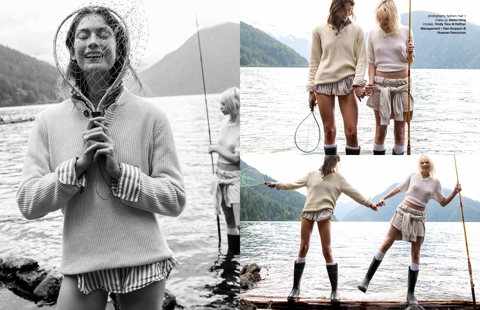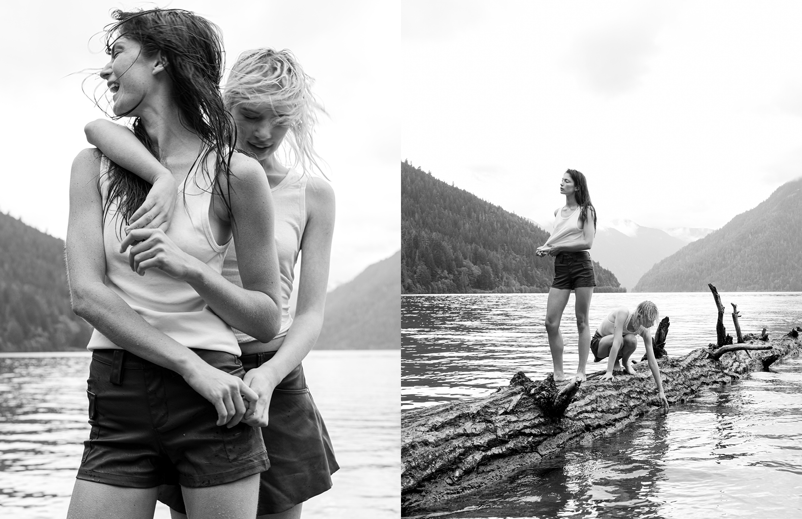 Wild hearts come alive in the still water in this Schön! online editorial photographed and styled by Adrien King. Models Trinity Trice and Rae Simpson wear Patagonia, Ralph Lauren, and Free People, backdropped by the great outdoors.