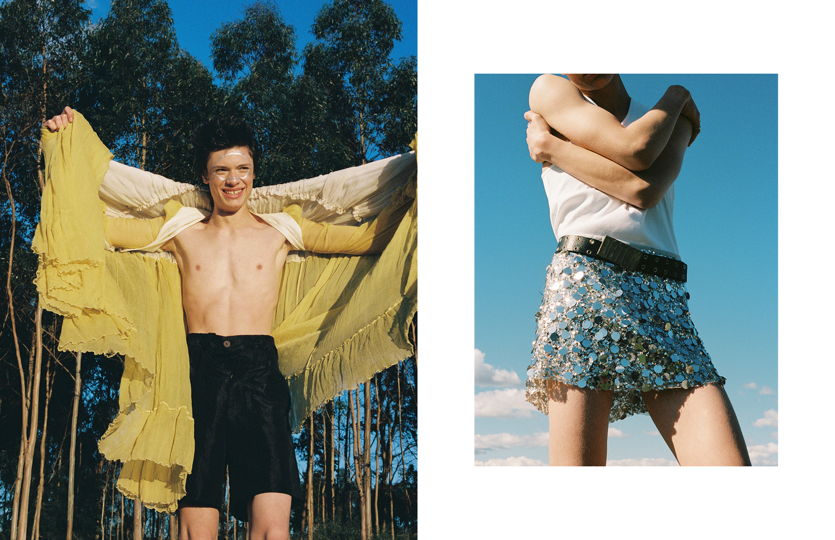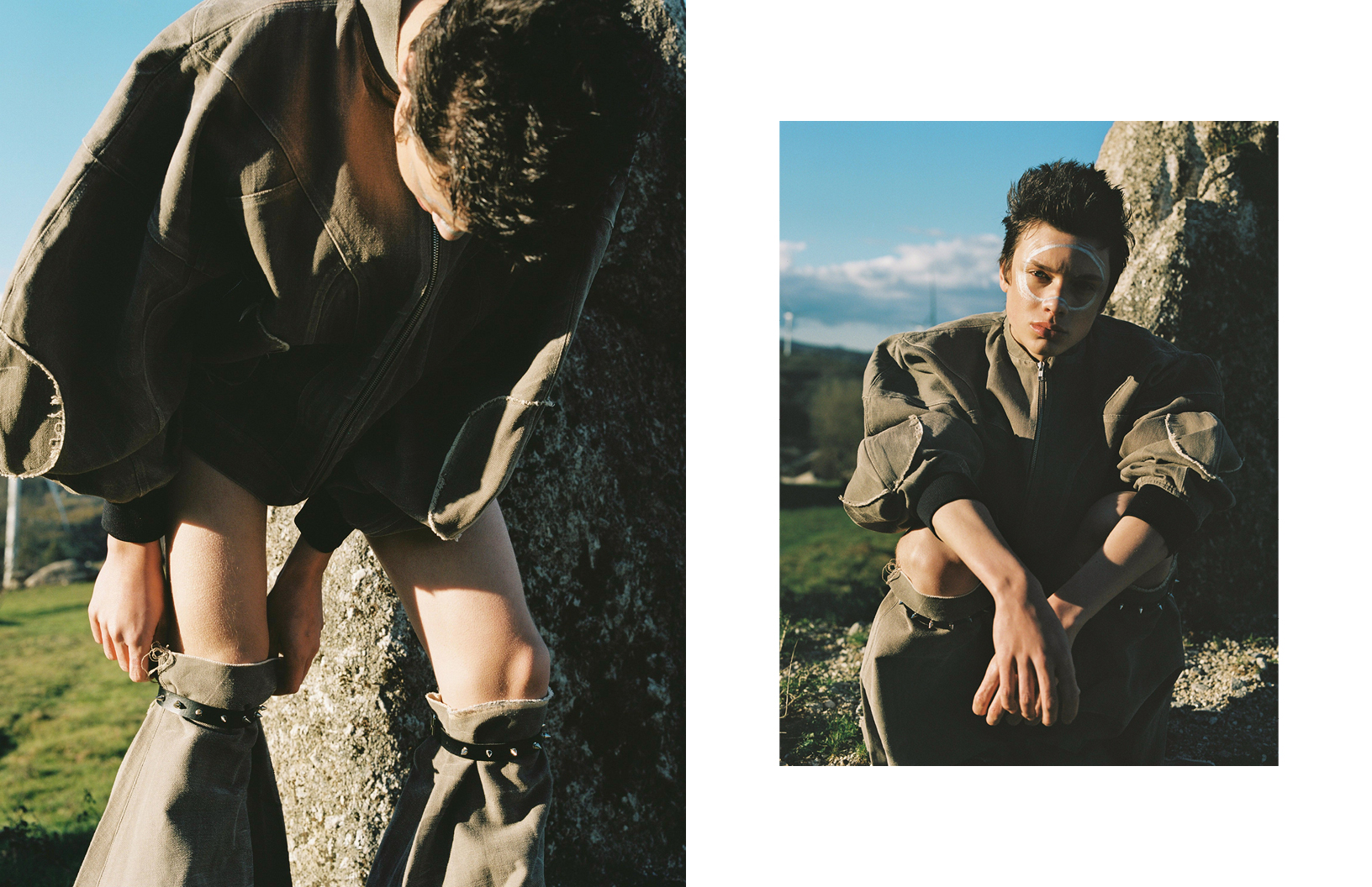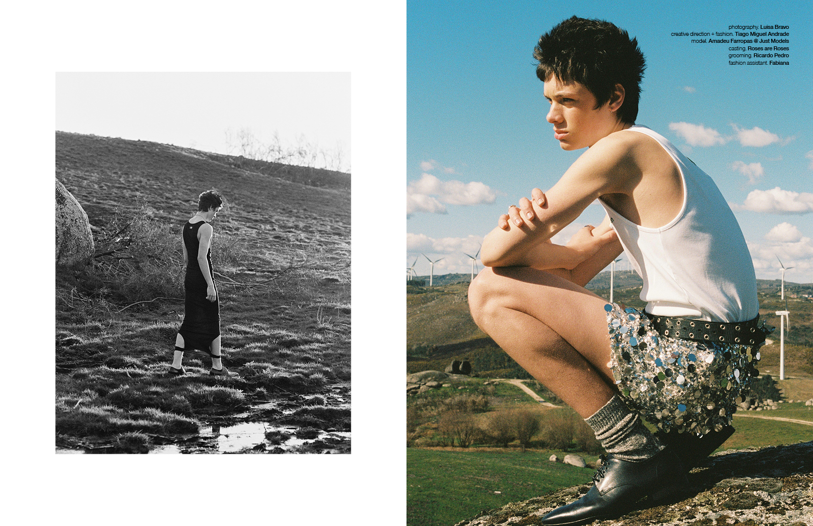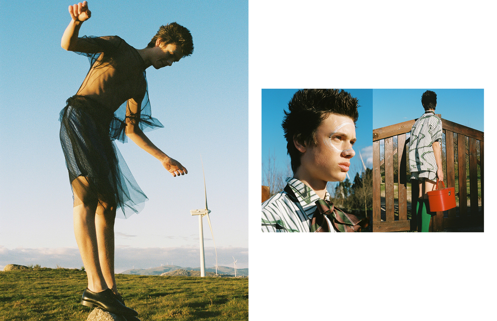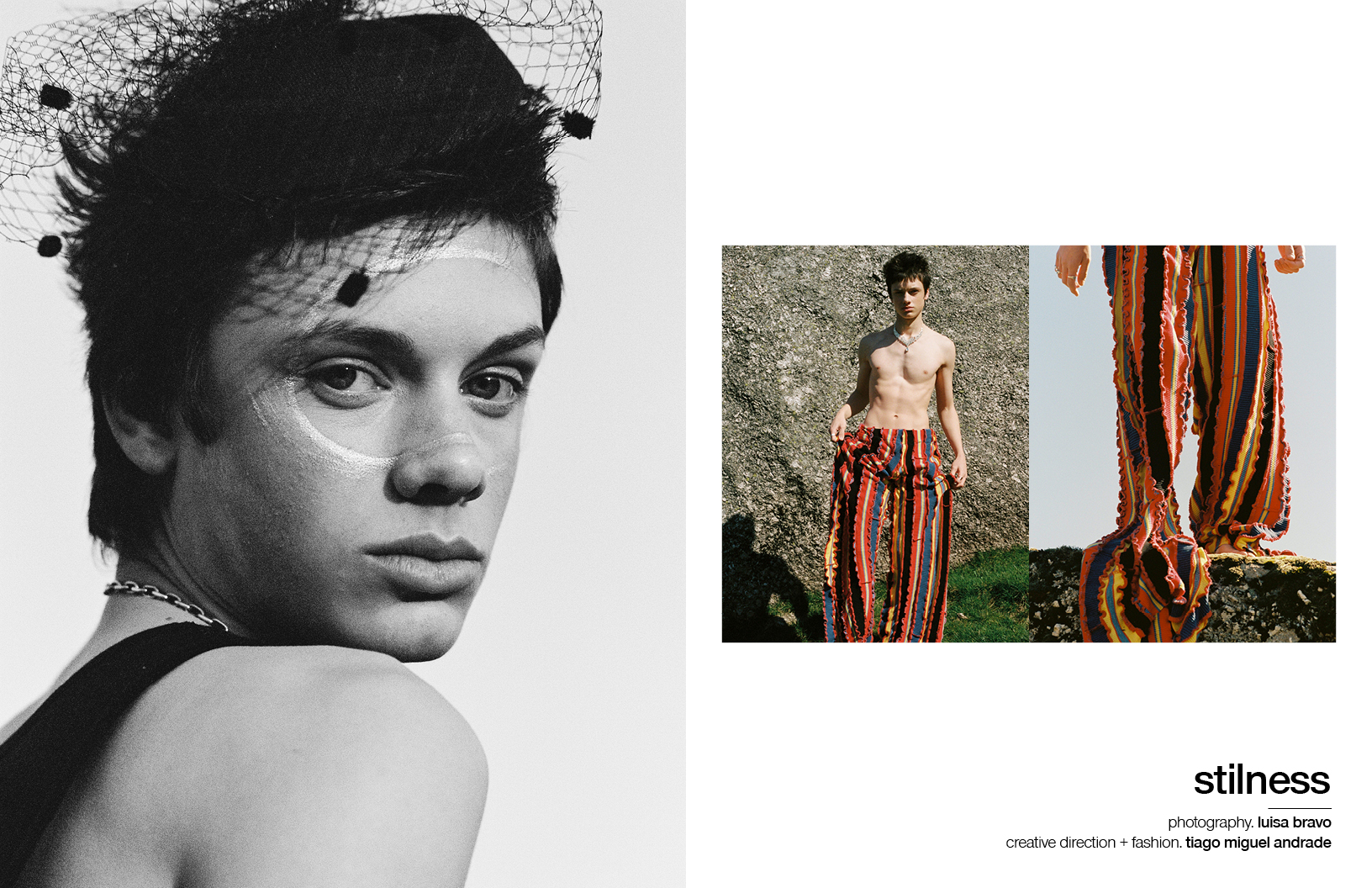 Styling itself drives the narrative, with pieces worn by Amadeu Farropas that shift between menswear and womenswear to challenge stereotypes and celebrate personal expression without the constraints of gender. Beauty choices, by Ricardo Pedro, including graphic makeup, amplify this vision by projecting a fluid, futuristic identity.