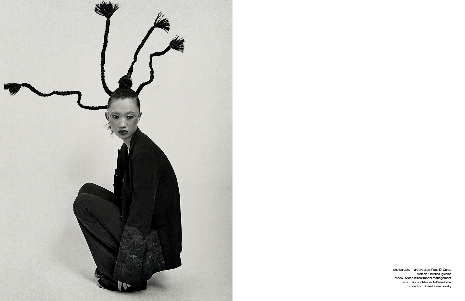 See every side of Aiwen in this Schön! editorial produced by Shani Chernihovsky and lensed by photographer Paco Di Canto with fashion by Carolina Iglesias who styles the model in looks by Sehnsucht Atelier, Marni and Lara Chamandi, with hair and make up by stylist Marom Tal Winshenk.