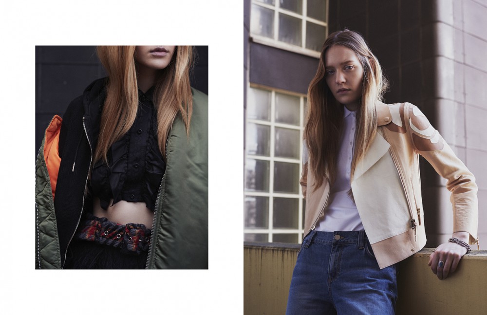 Jacket /Alpha Industries Top, skirt & belt / Miu Miu Hoodie / Stylist´s own Opposite Jacket / Tod´s Polo shirt / Lacoste Jeans / & Other Stories Ring / Werkstatt Muenchen