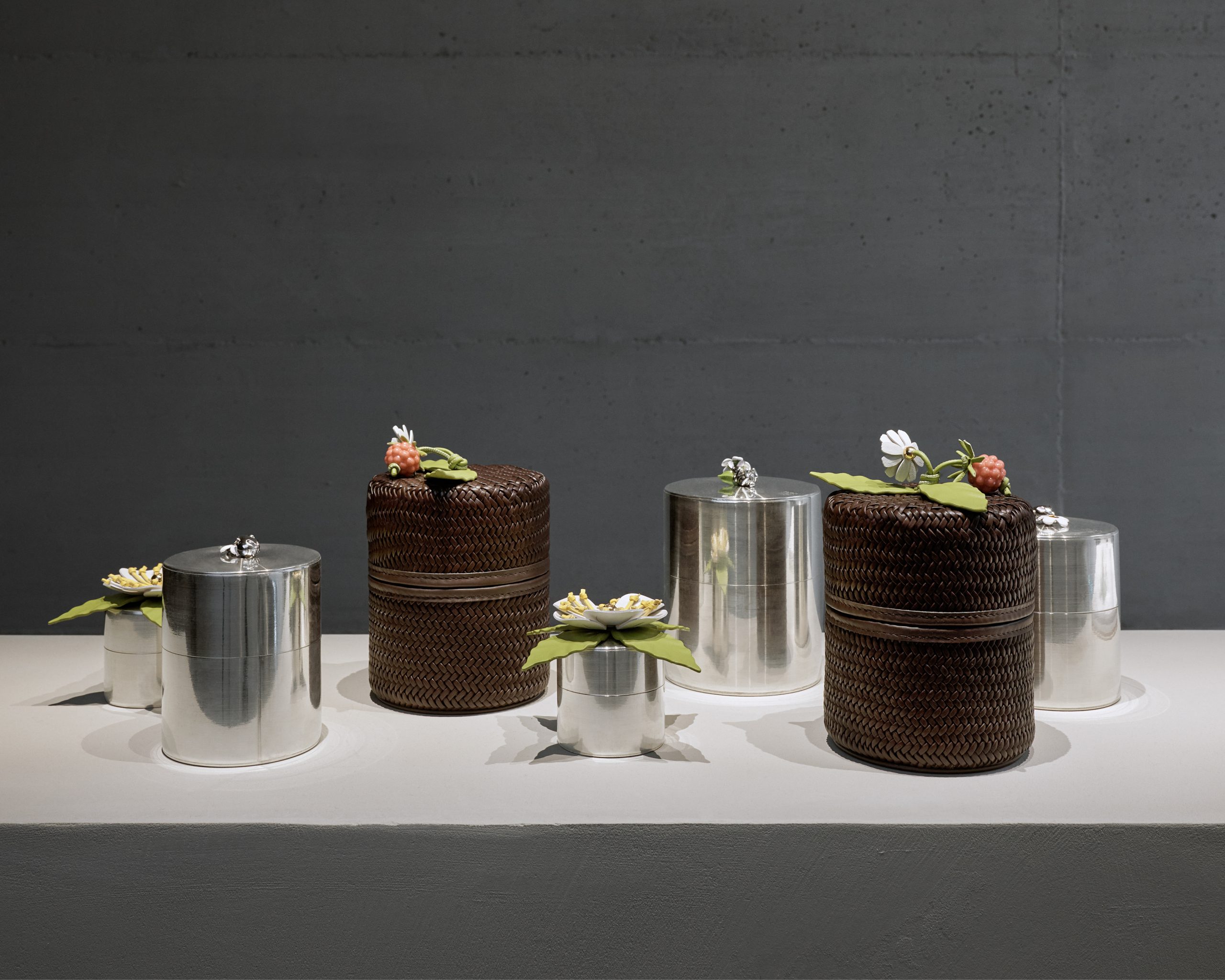 In conjunction with the exhibition, an exclusive collection of LOEWE homeware products will be available for purchase at the Palazzo Citterio, including woven leather coasters, tea cosies, and leather bag charms shaped like strawberries, chamomile flowers, bergamot fruits, and tea bags.