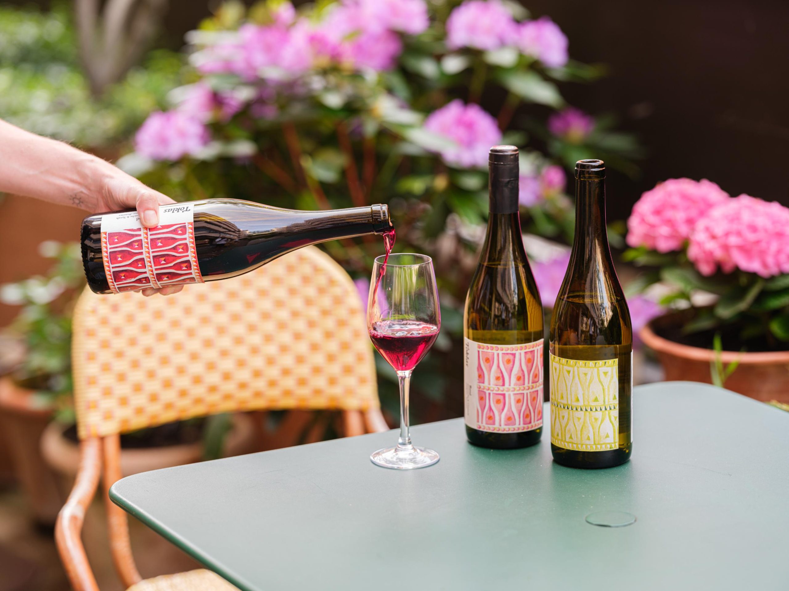 For this first edition of cuvées, Toklas commissioned Turner Prize-winning artist Lubaina Himid CBE to paint colourful limited edition labels. “There’s a good history of artists designing wine bottles and menus,” says Slotover. He notes artists like David Hockney, who once designed the Neal Street restaurant menu, as well as a label for Château Mouton Rothschild. (The label has also been designed by artists Pablo Picasso, Salvador Dalí, Dorothea Tanning and Francis Bacon over the years). For her part, Himid used her signature palette of vibrant hues to paint rows of elegantly simplistic bottles in shades of crimson, blushing pink and citrus. “Lubaina Himid has got an incredible career,” says Basilico of the painter known for being one of the UK’s most important contributors to the British Black arts movements, and the first Black woman to win the Turner Prize. “For a female artist and female winemaker to unite like this is quite powerful in this day and age.”
