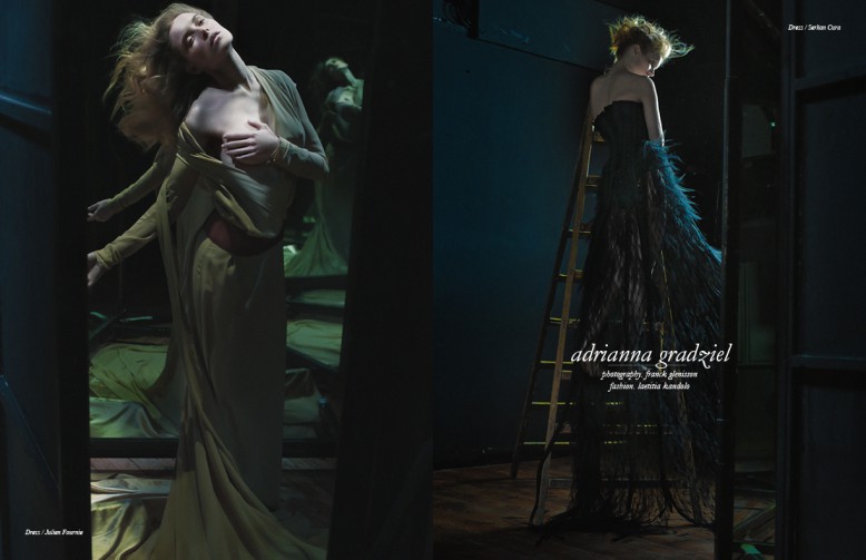 Venture into the forests for this Schön! online editorial by photographer and make up artist Franck Glenisson. Our talents wear pieces from Julien Fournie, Serkan Cura, Alaïa and others styled by Laetitia Kandolo. Hair for the piece is by Cyril Nanino.