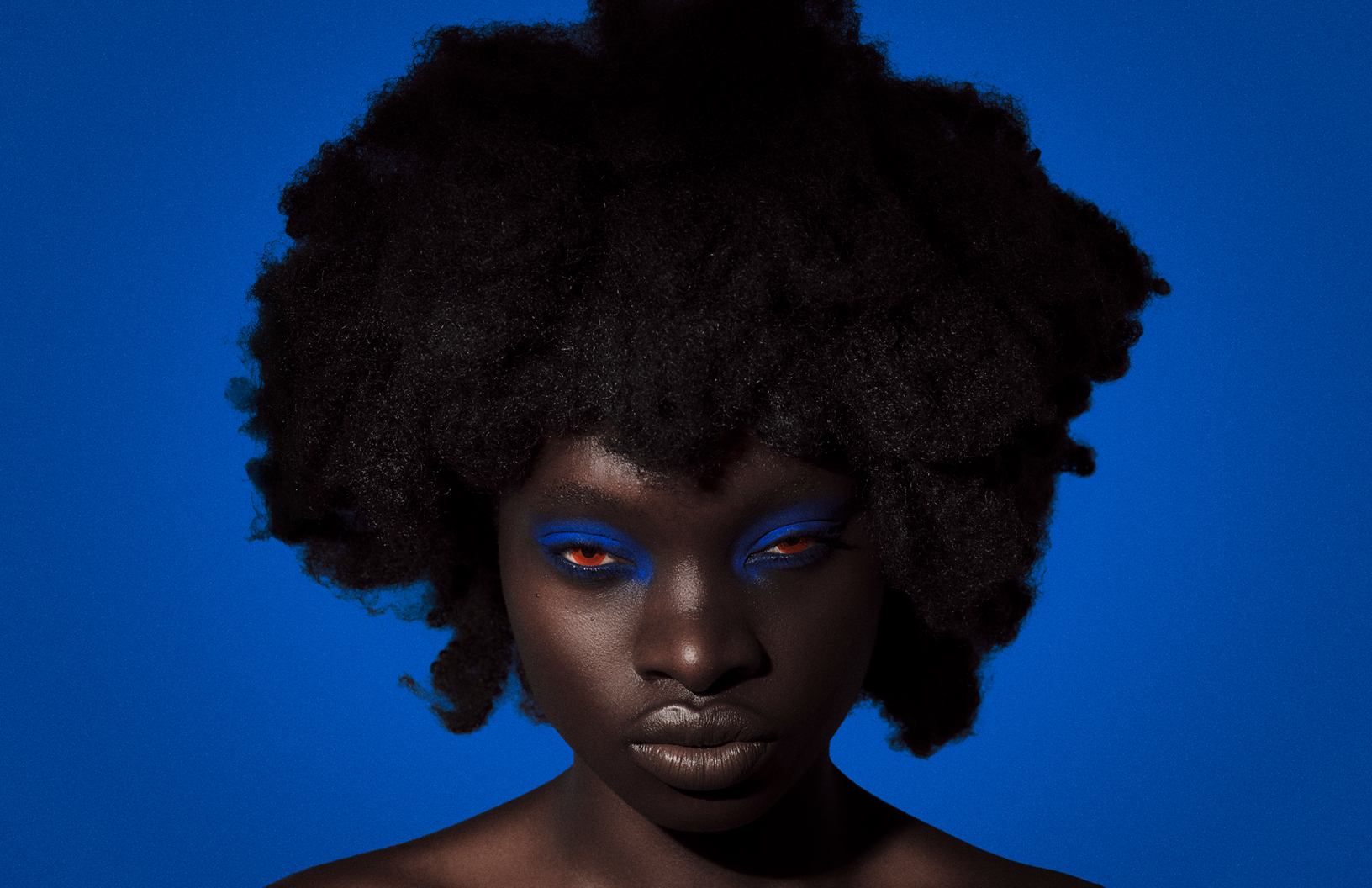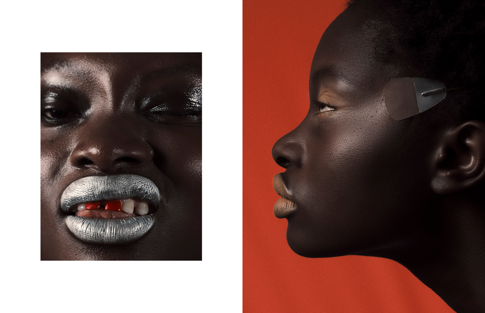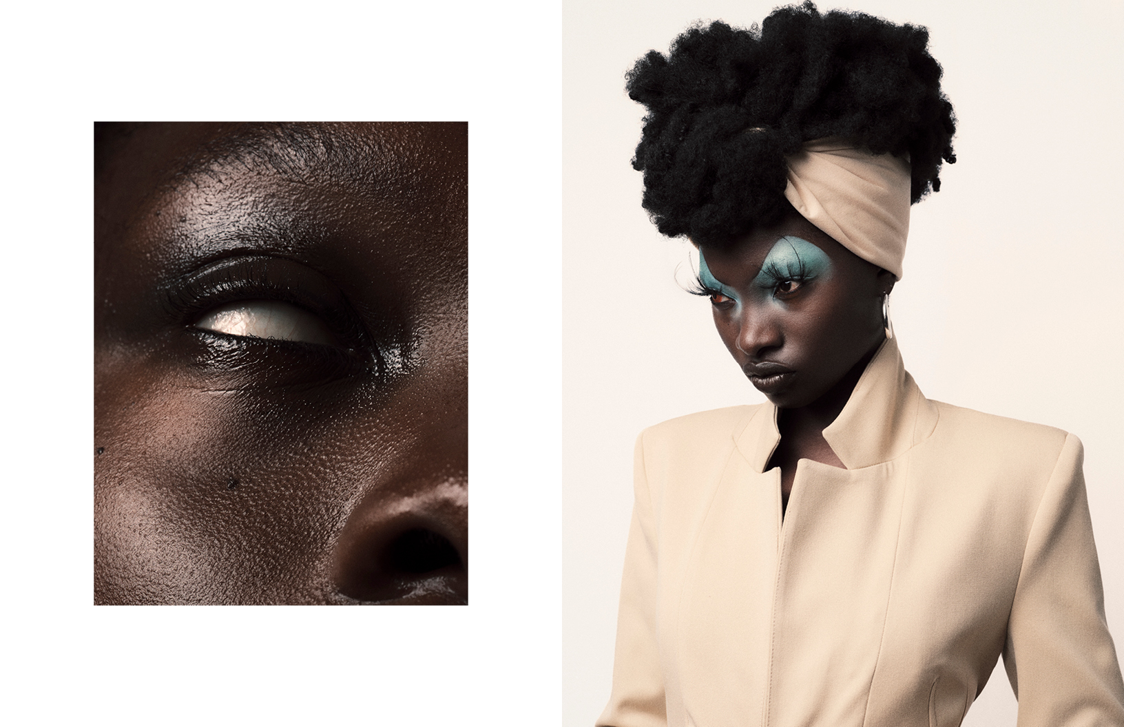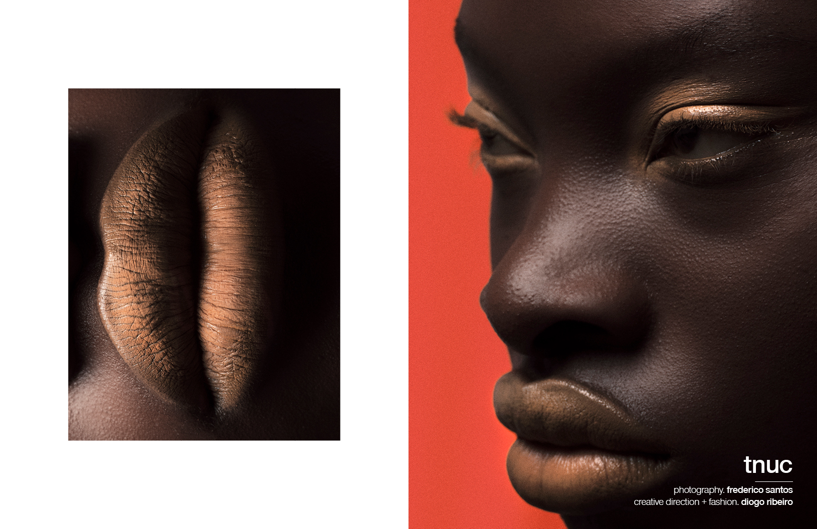 This Schön! editorial is lensed by Santos with creative direction and make up by Diogo Ribeiro who uses beauty products by MAC, Fenty Beauty, Make Up For Ever, and more on model Carminda.