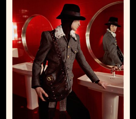 Reappearing at the heart of the campaign is the striking, bright red tiled public bathroom — a key visual from the runway show. For Michele, it serves as more than a backdrop. It is a powerful liminal space, suspended between the public and the private. Here, intimacy and performance collide, private and relational dimensions overlap, the visible challenges the invisible, decency wrestles with guilty pleasure, and exposure entwines with concealment.