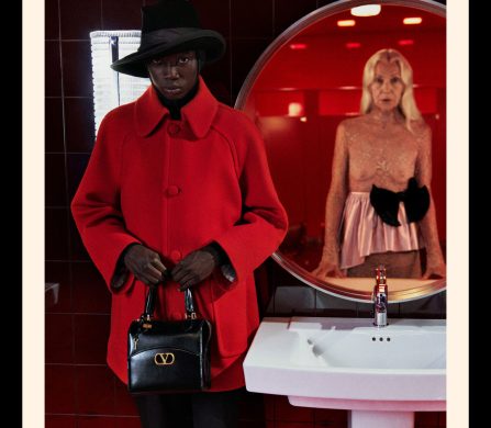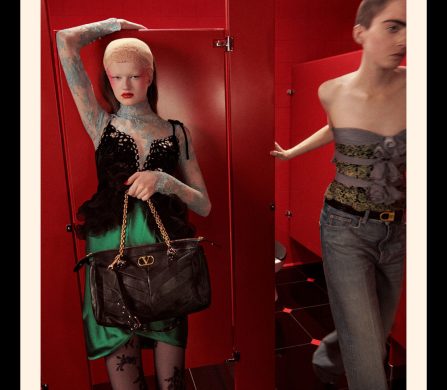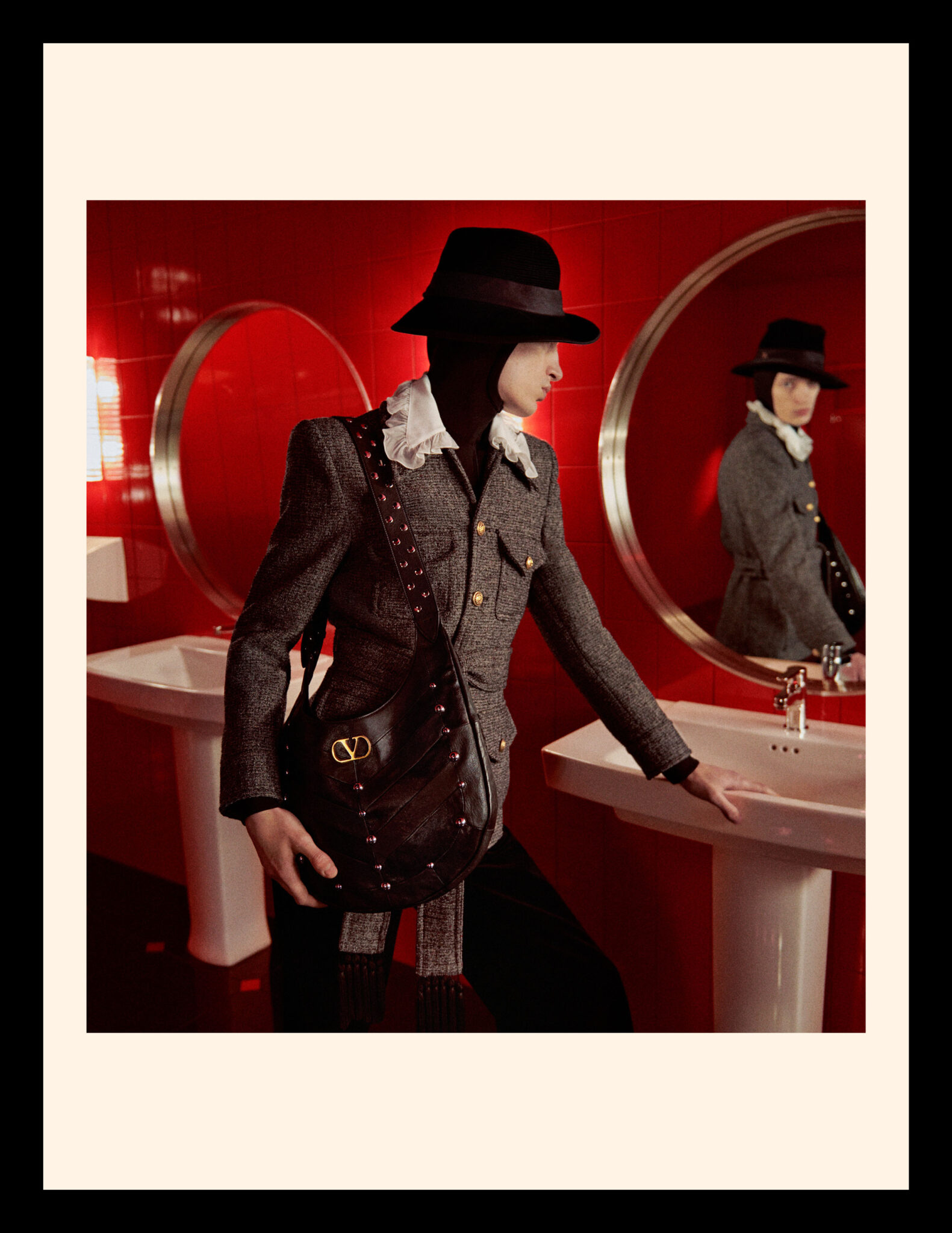 These themes are further heightened in the campaign video. A model leans quietly against a closed stall door while another blurs past. Pfahler peers through a rounded peephole into the restroom, disrupting the boundary between observer and participant. A convex mirror catches a corner of the room as figures slip in and out – a reminder that what is meant to be private is somehow always exposed. Shoes peek from beneath the stalls, hinting at the unseen stories within. Rounded mirrors capture fragments of desire, of self-reflection. In one moment, a model chops off her hair into the sink, a Valentino bag carefully framed in view; in another, a character reclines in a rectangular bathtub, dressed in sheer, skin-tight lace.