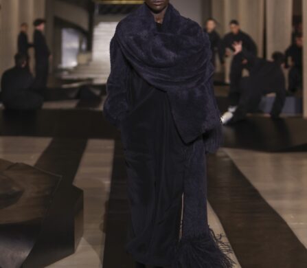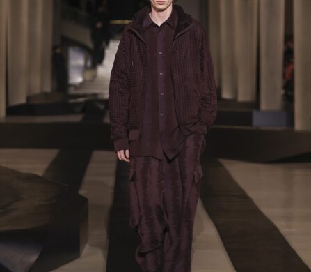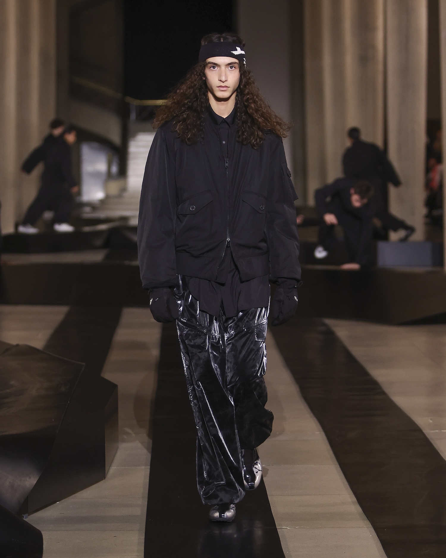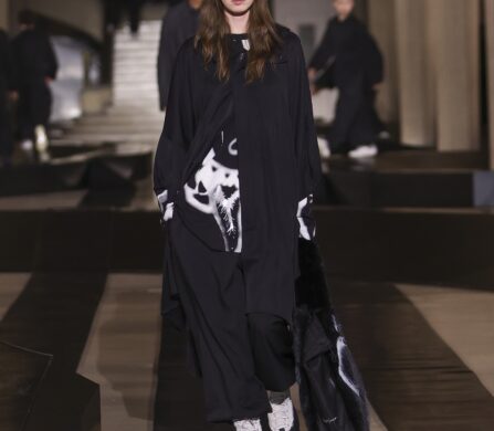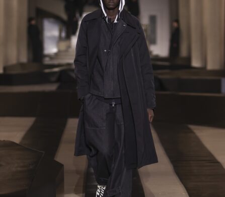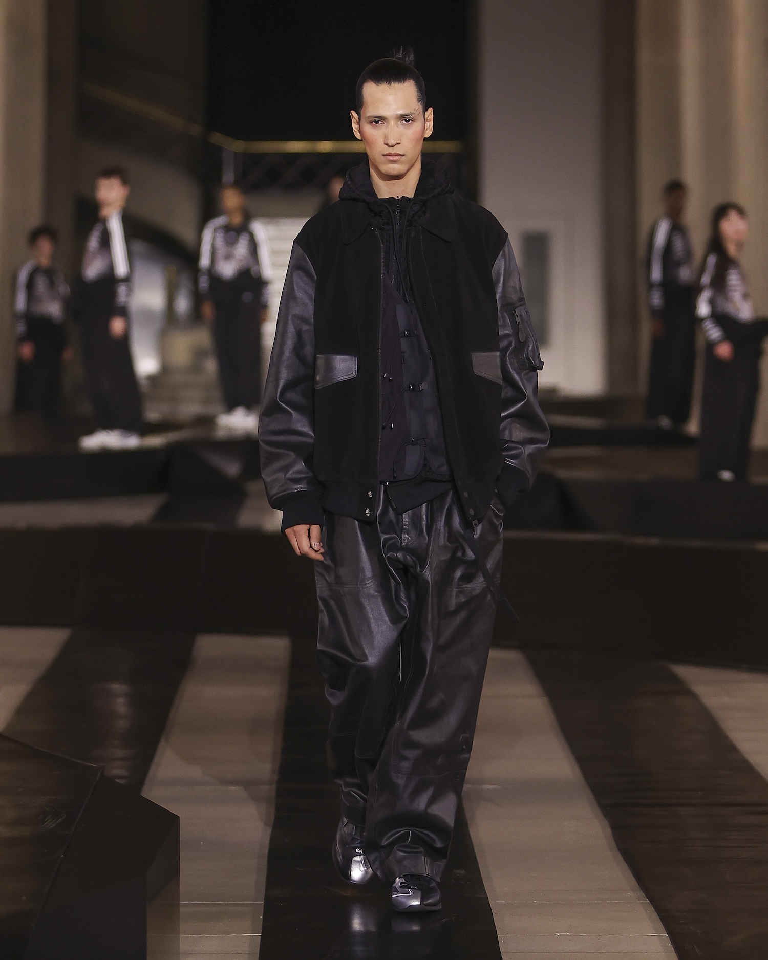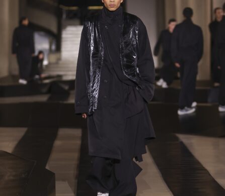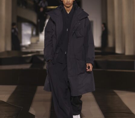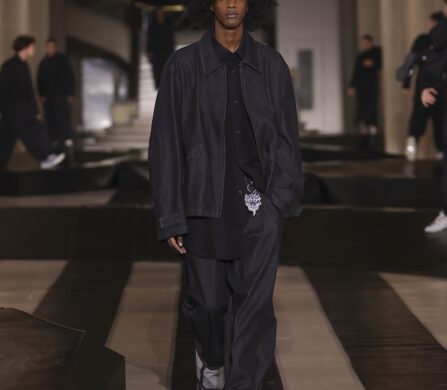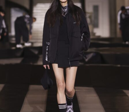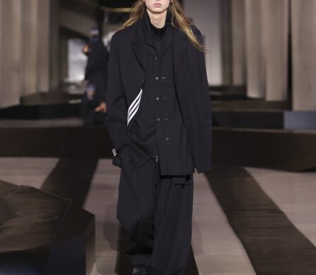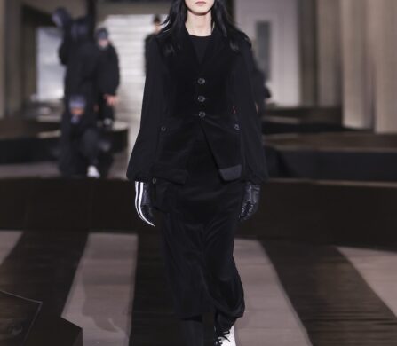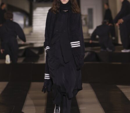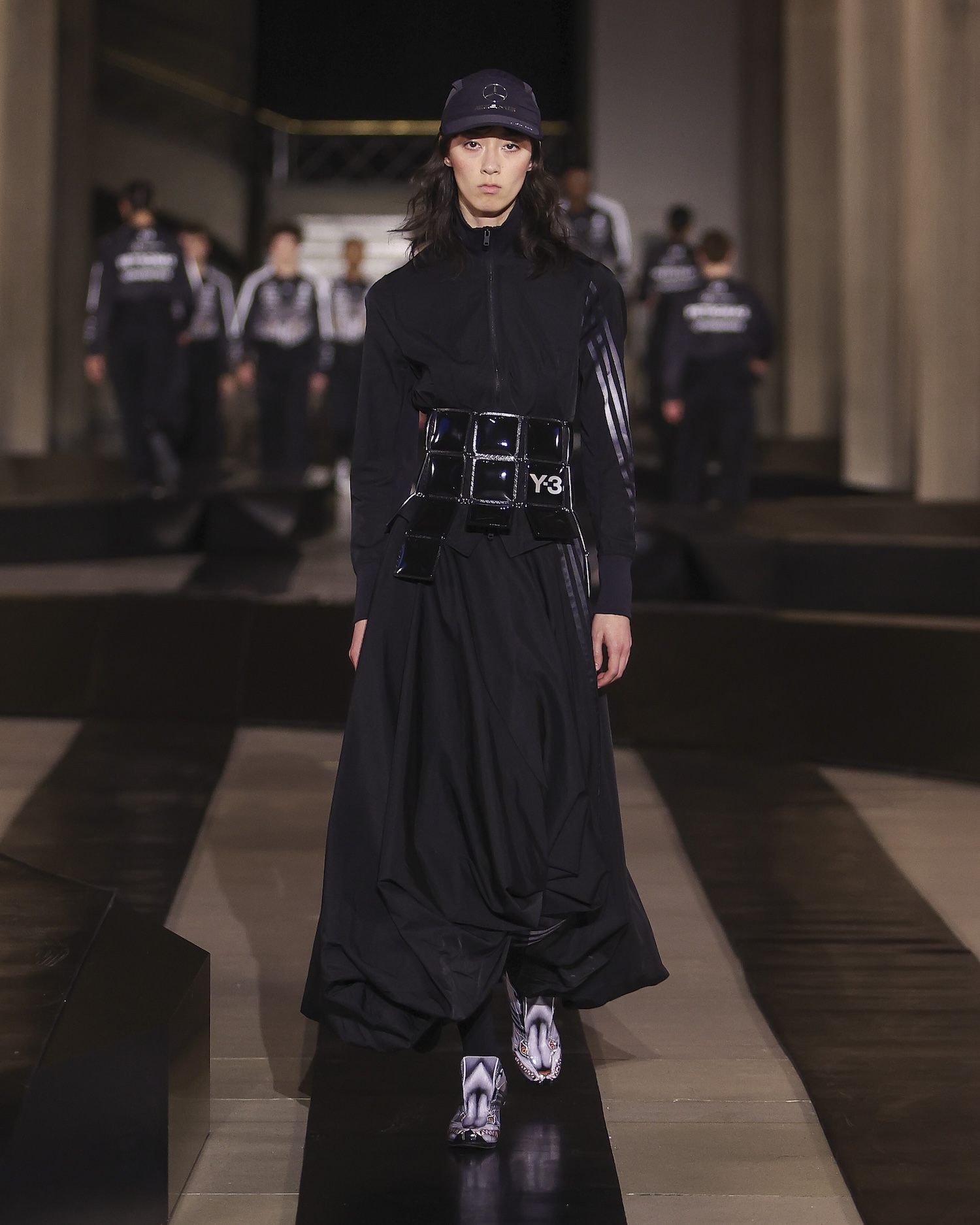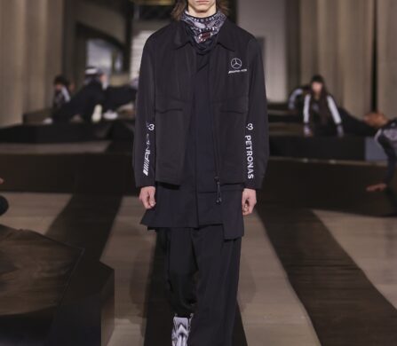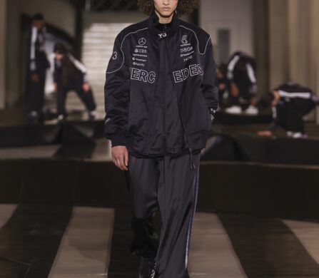 For this outing, Yohji Yamamoto and Adidas pivoted from the pavement to the pit lane, unveiling a heavyweight collaboration with the Mercedes-Amg Petronas Formula One team. The show functioned as an immersive performance, with a wolfpack of dancers and a pit-crew of performers dressed in all-black tailored boiler suits who navigated a stage rigged with ramps and glowing Three Stripes.