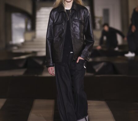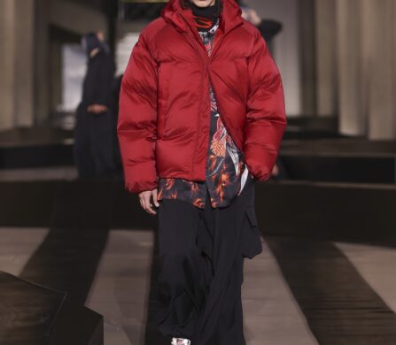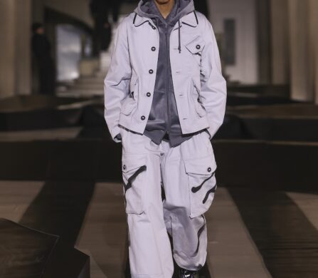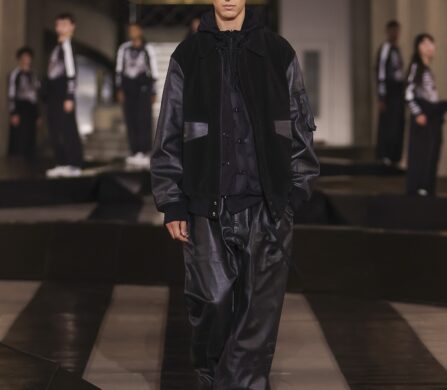 Throughout the collection, the tailoring was built for a life in flux. Adaptive buttons and interchangeable details invite the wearer to tinker with the shape, making the clothes feel like an evolving uniform. Sporting jerseys emerged as a recurring pulse through the show, while traditional trenches and leather pieces were gutted and reworked to sit alongside high-spec technical layers.