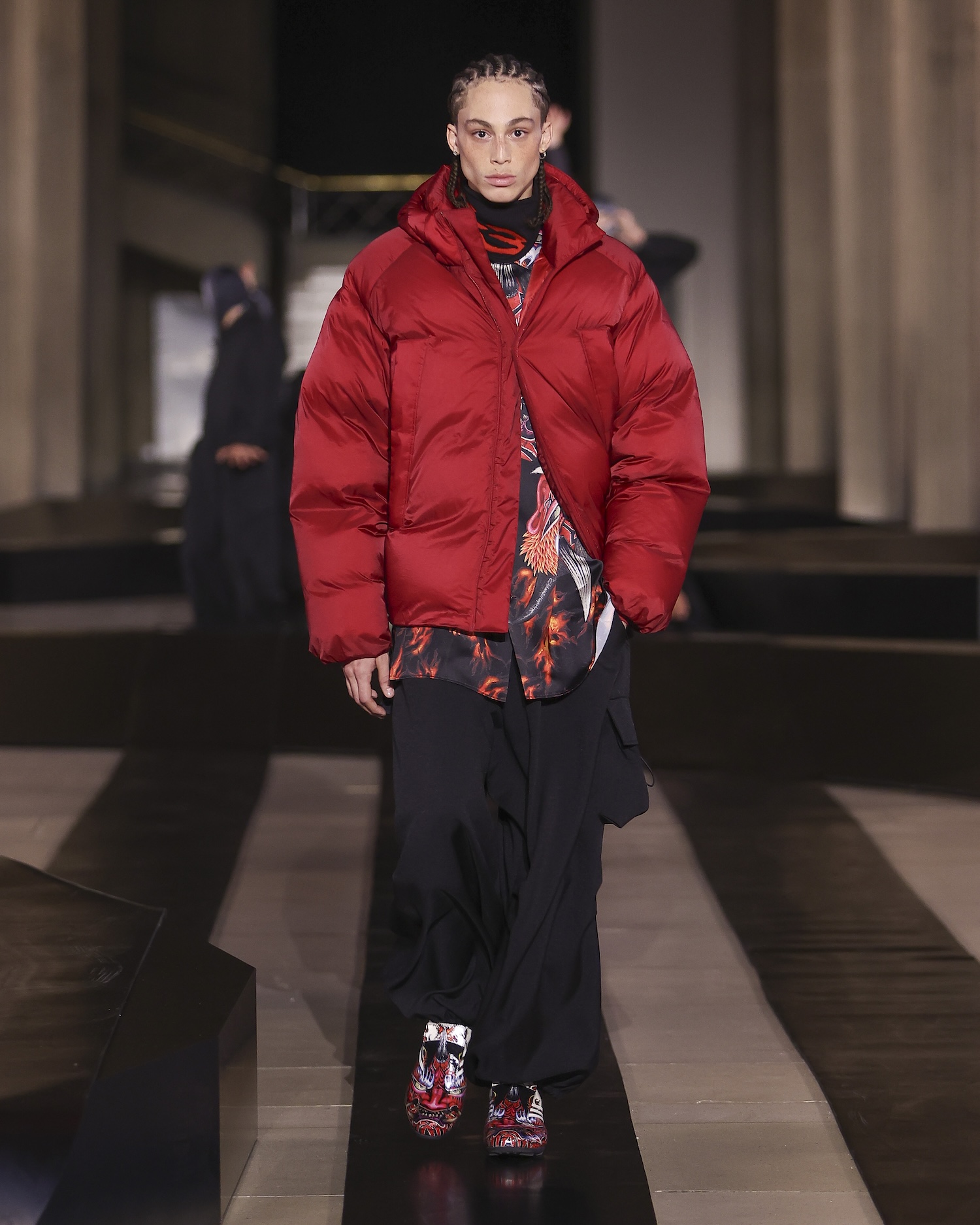 Visually, the collection felt like a deliberate clash of textures and eras. Long-standing collaborator Chikami Hayashi’s refined artwork was placed in a direct, almost combative dialogue with the transgressive artist Chito, whose signature spray-painted graphics mutated the iconic Three Stripes into something unrecognisable and feral. This ‘Beast’ motif – a creature that originally stalked the Yohji Yamamoto mainline runways – found a new home across prints and footwear, adding a touch of beautiful, monstrous surrealism to the technical performance-wear.