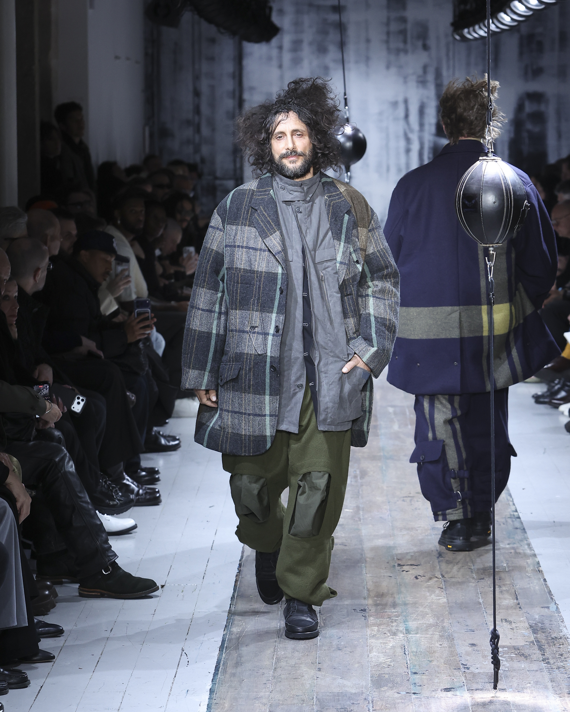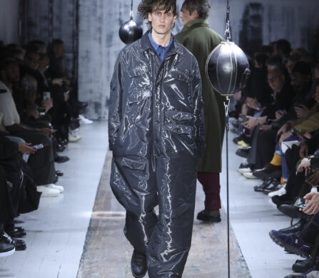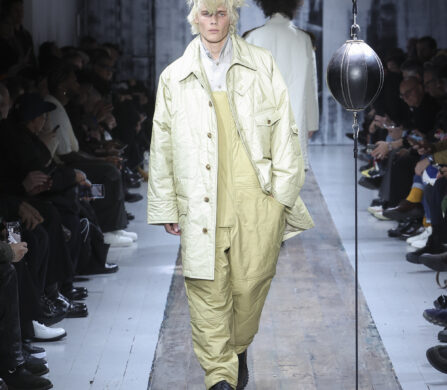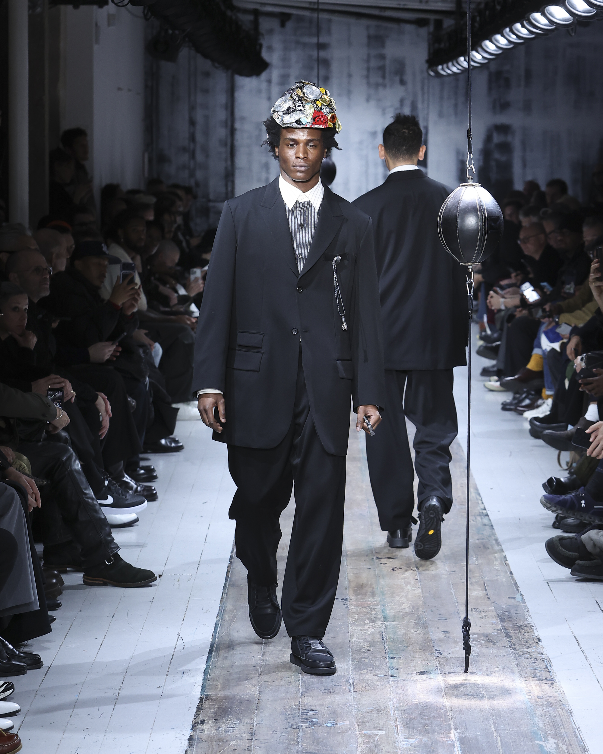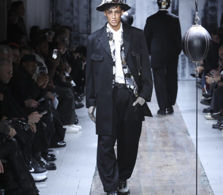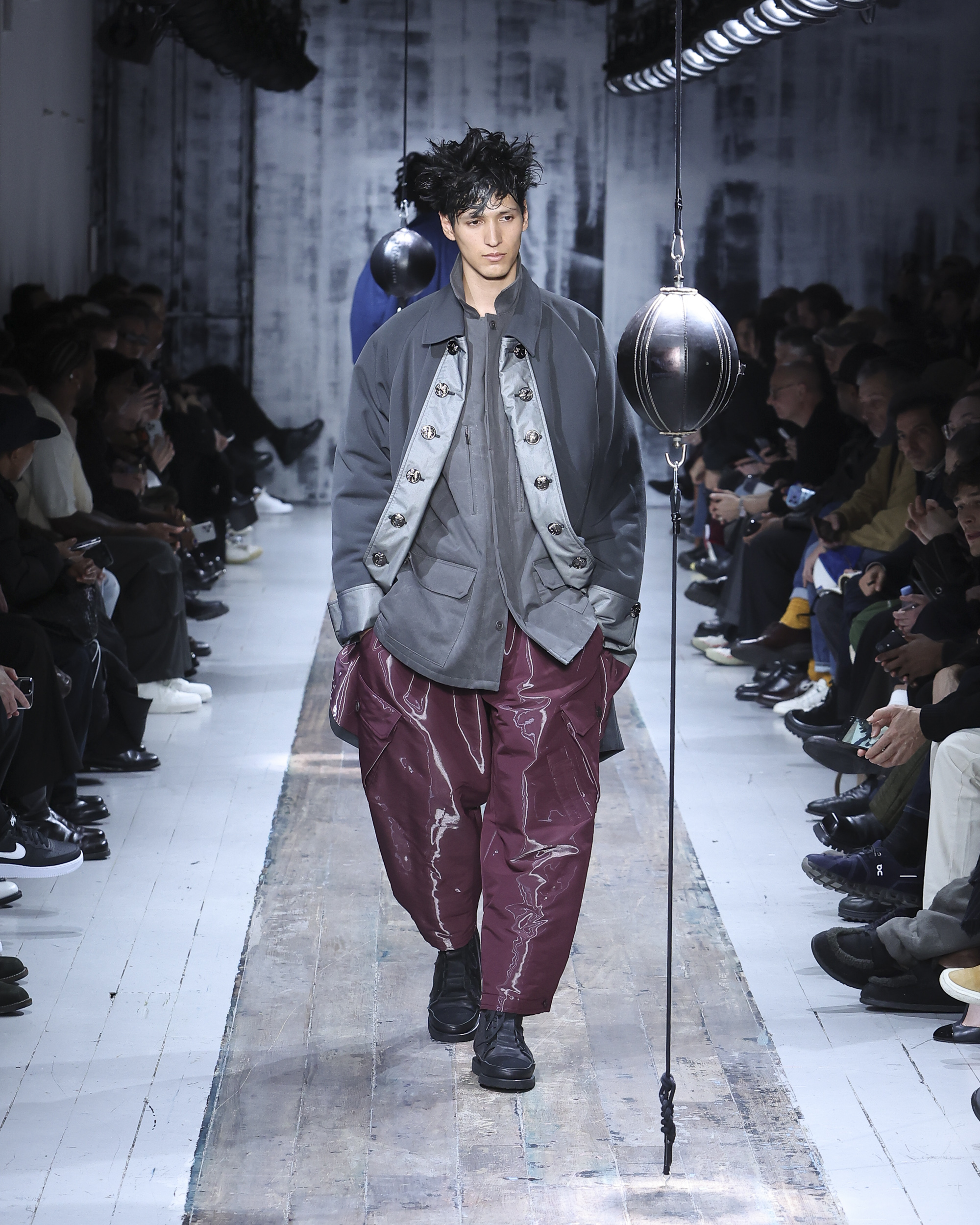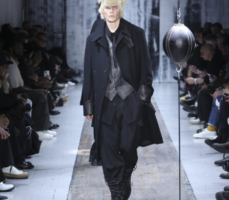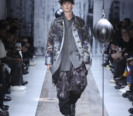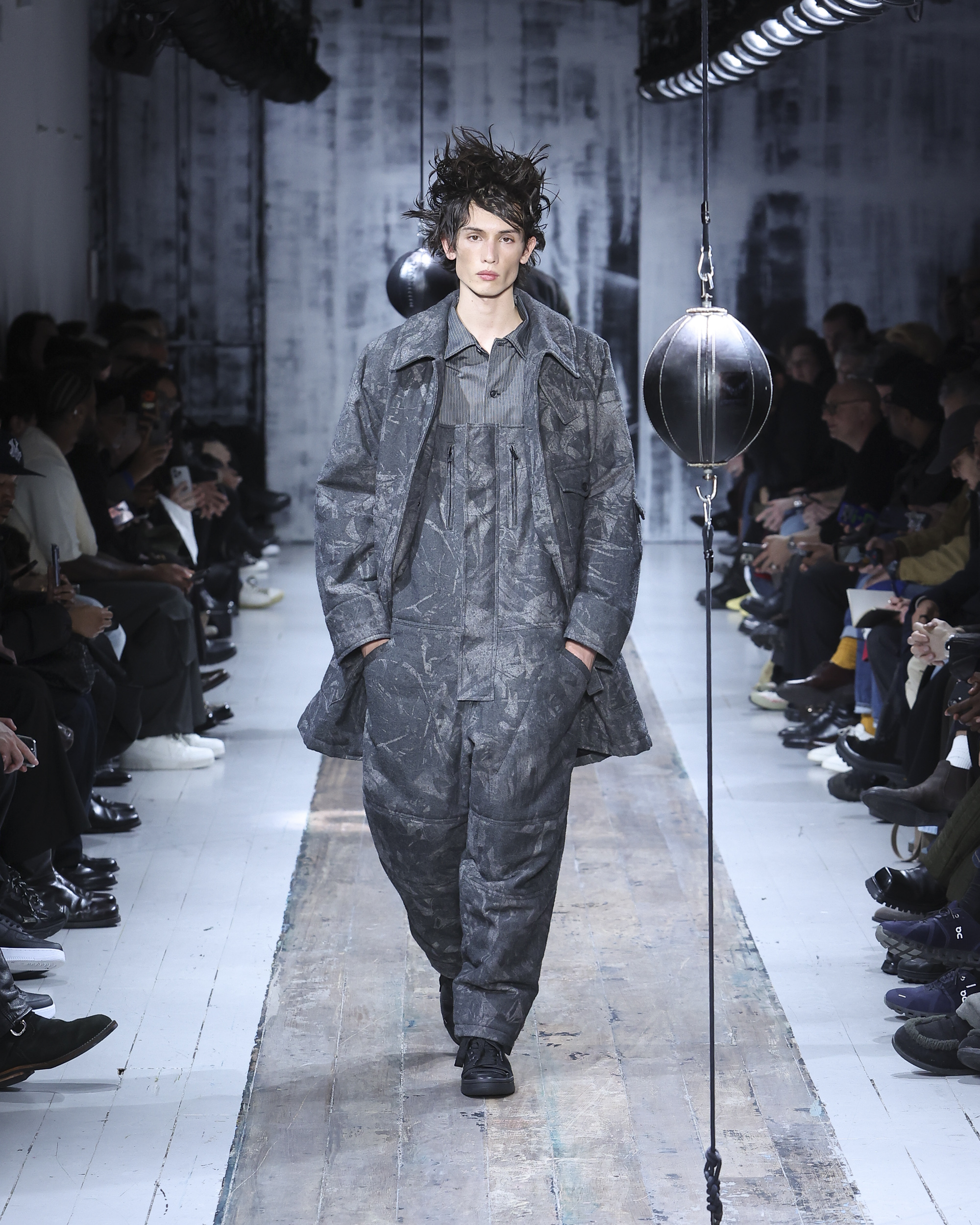 The runway itself felt as interactive as the garments. Models weaved through two speed bags suspended in mid-air, each reacting differently – tapping, punching, or simply staring them down. Even Yamamoto took a moment to engage, gently stroking the speed bags as he entered for the show’s finale, blurring the line between observer, creator, and participant.