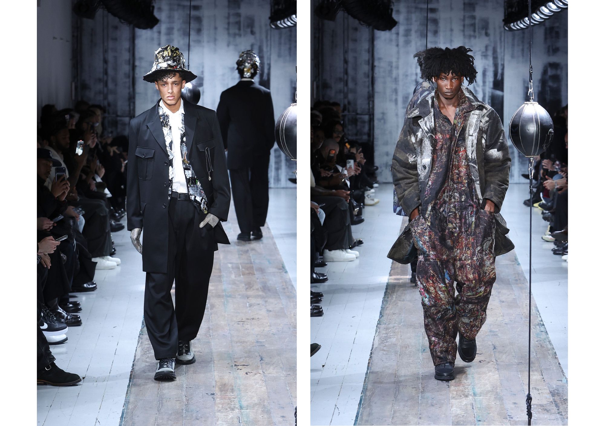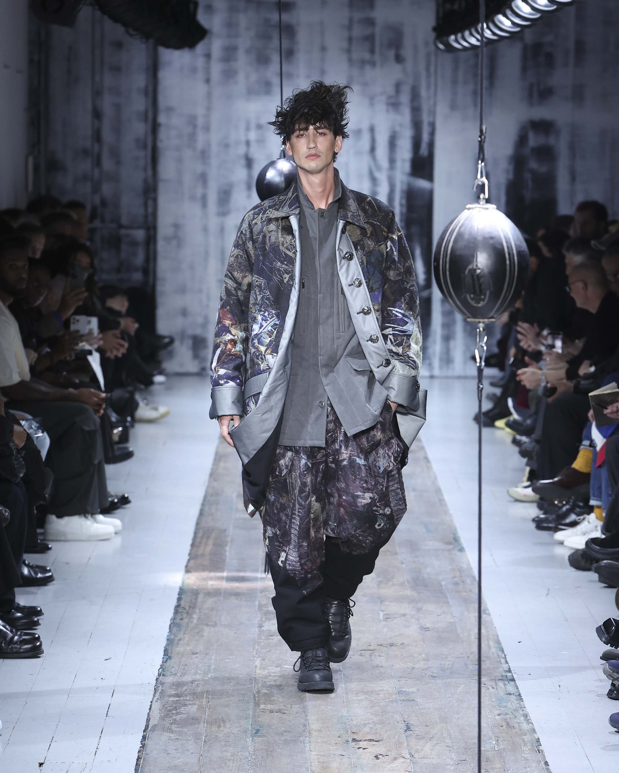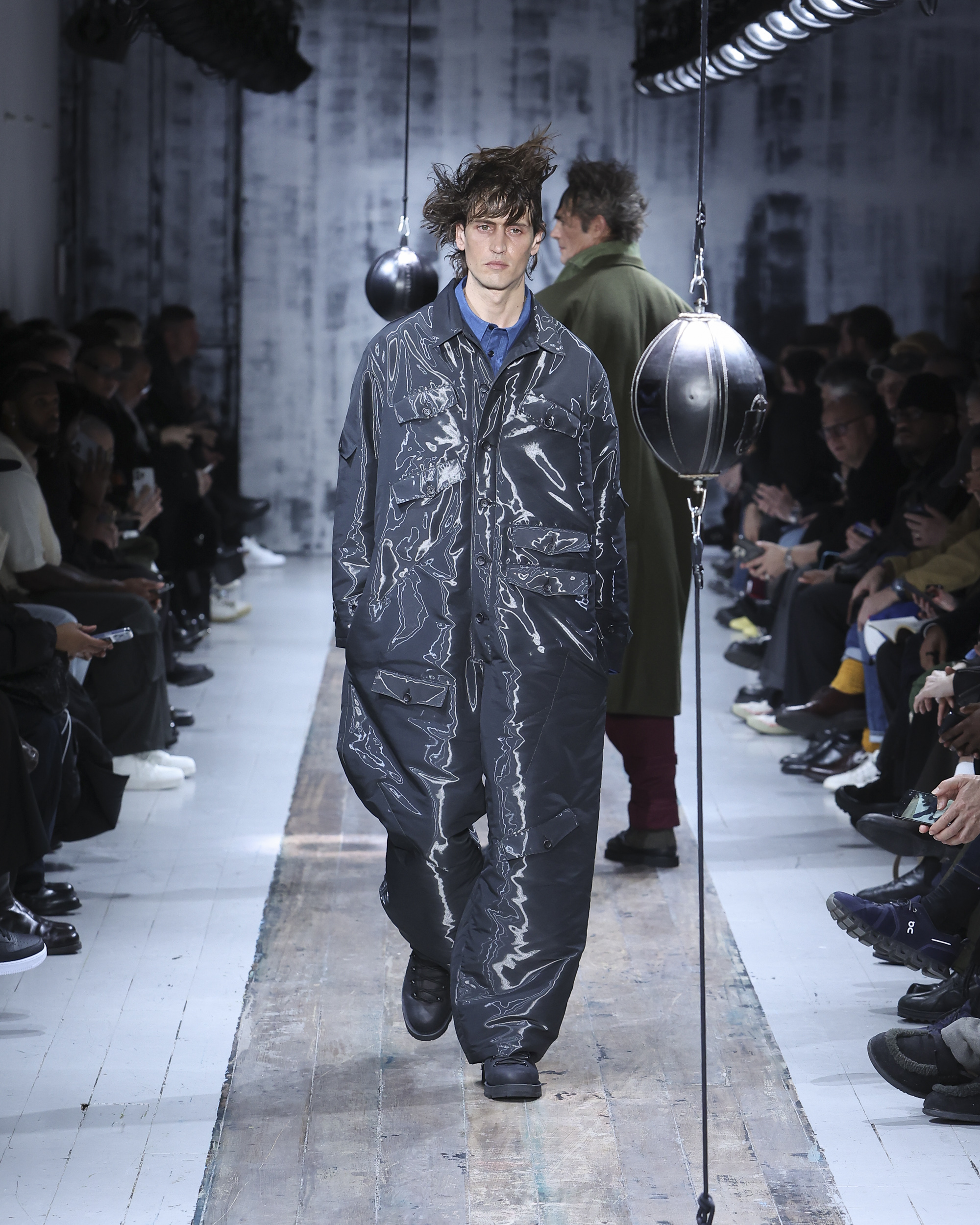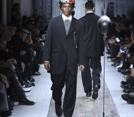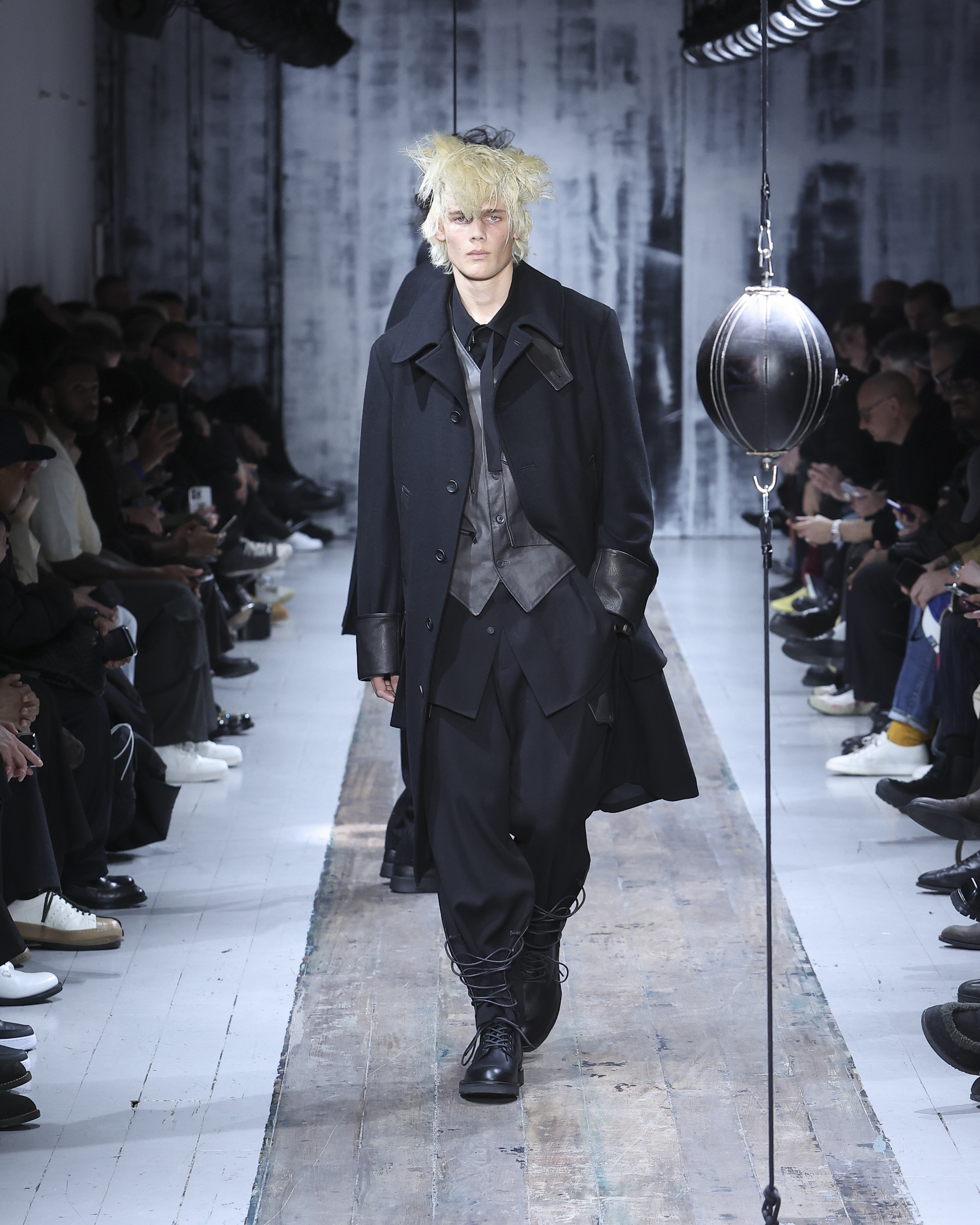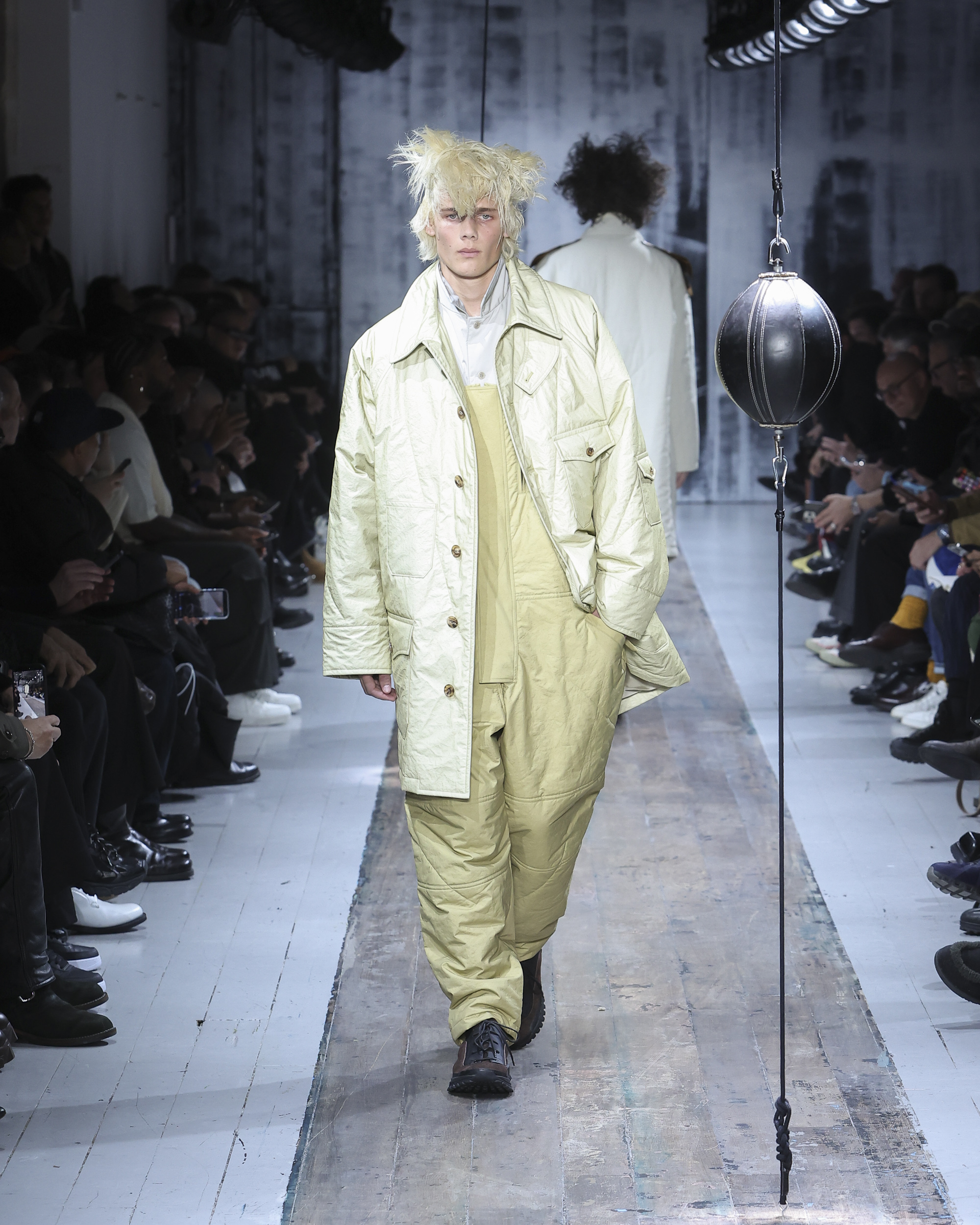 The runway itself felt as interactive as the garments. Models weaved through two speed bags suspended in mid-air, each reacting differently – tapping, punching, or simply staring them down. Even Yamamoto took a moment to engage, gently stroking the speed bags as he entered for the show’s finale, blurring the line between observer, creator, and participant.