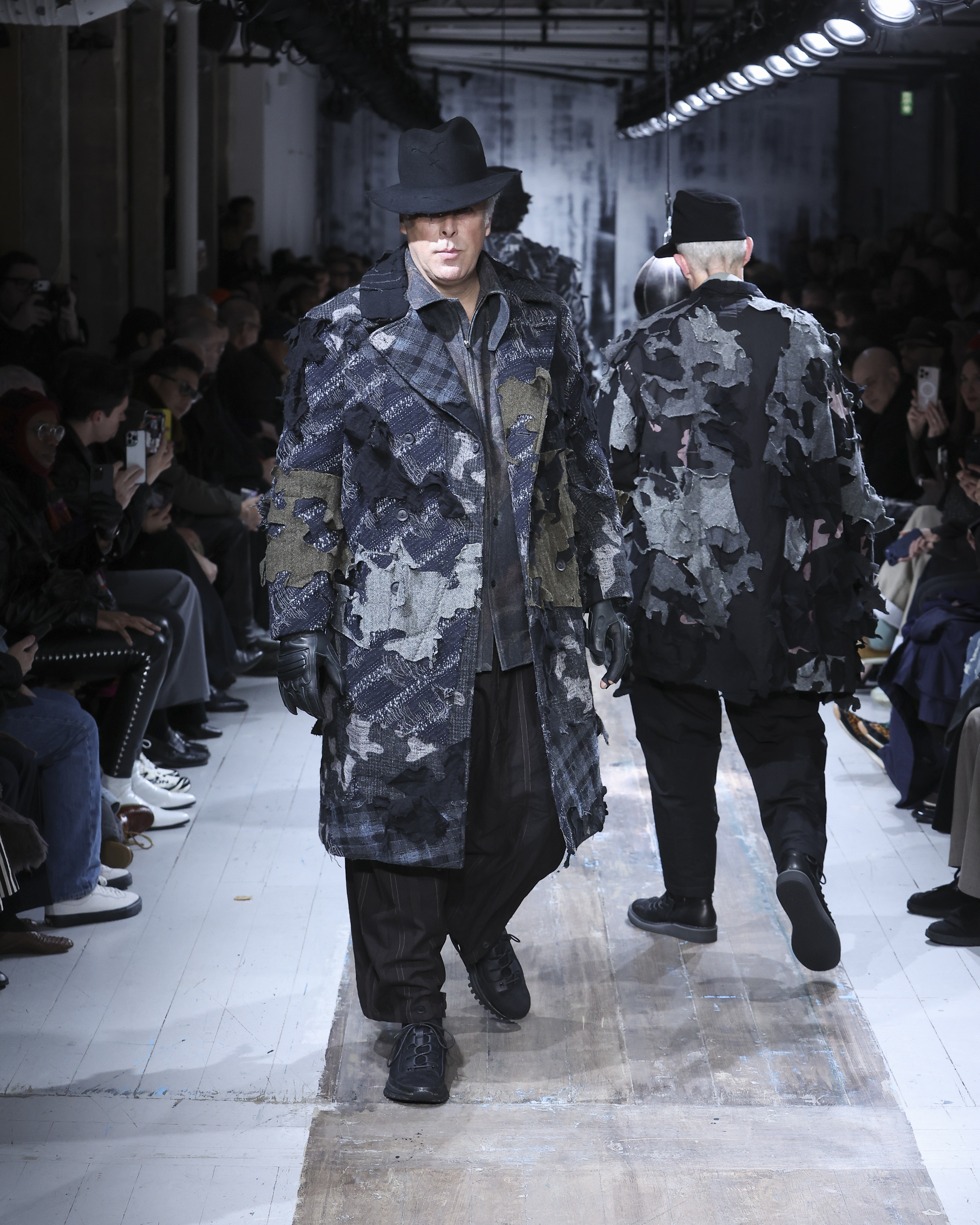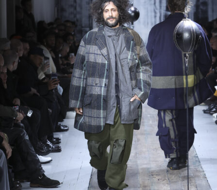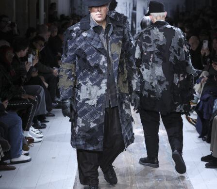 Even with a signature look that has been revered for decades, Yohji Yamamoto still knows how to up the ante with each and every collection. His ‘Pour Homme’ Autumn/Winter 2026 offering is no exception. Drawing from military and mechanical uniforms, the collection moves on a deliberate journey – from full camouflage looks to patent boiler suits, into tailored suiting, and then back again to camouflage, creating a cyclical rhythm on the runway.